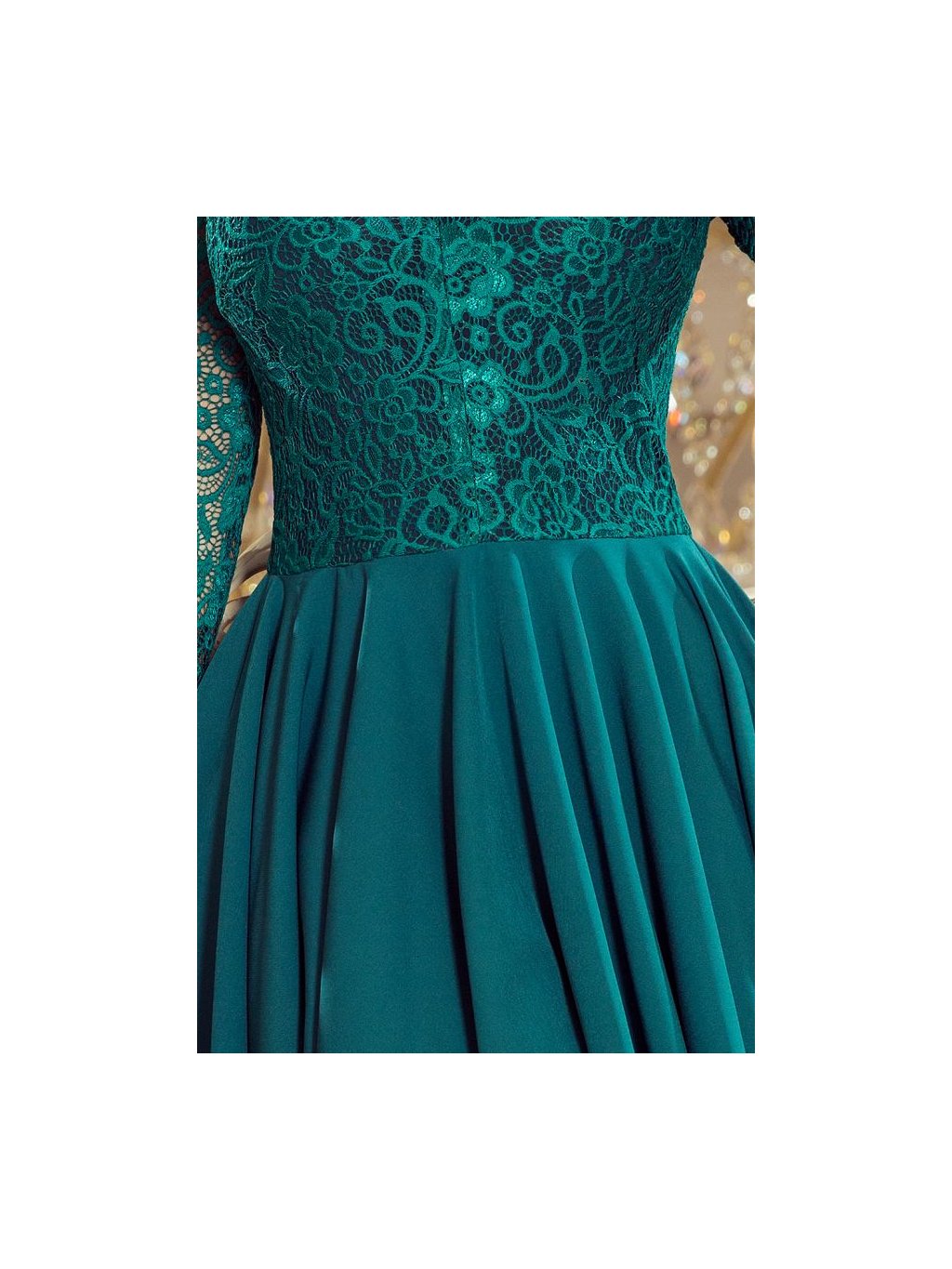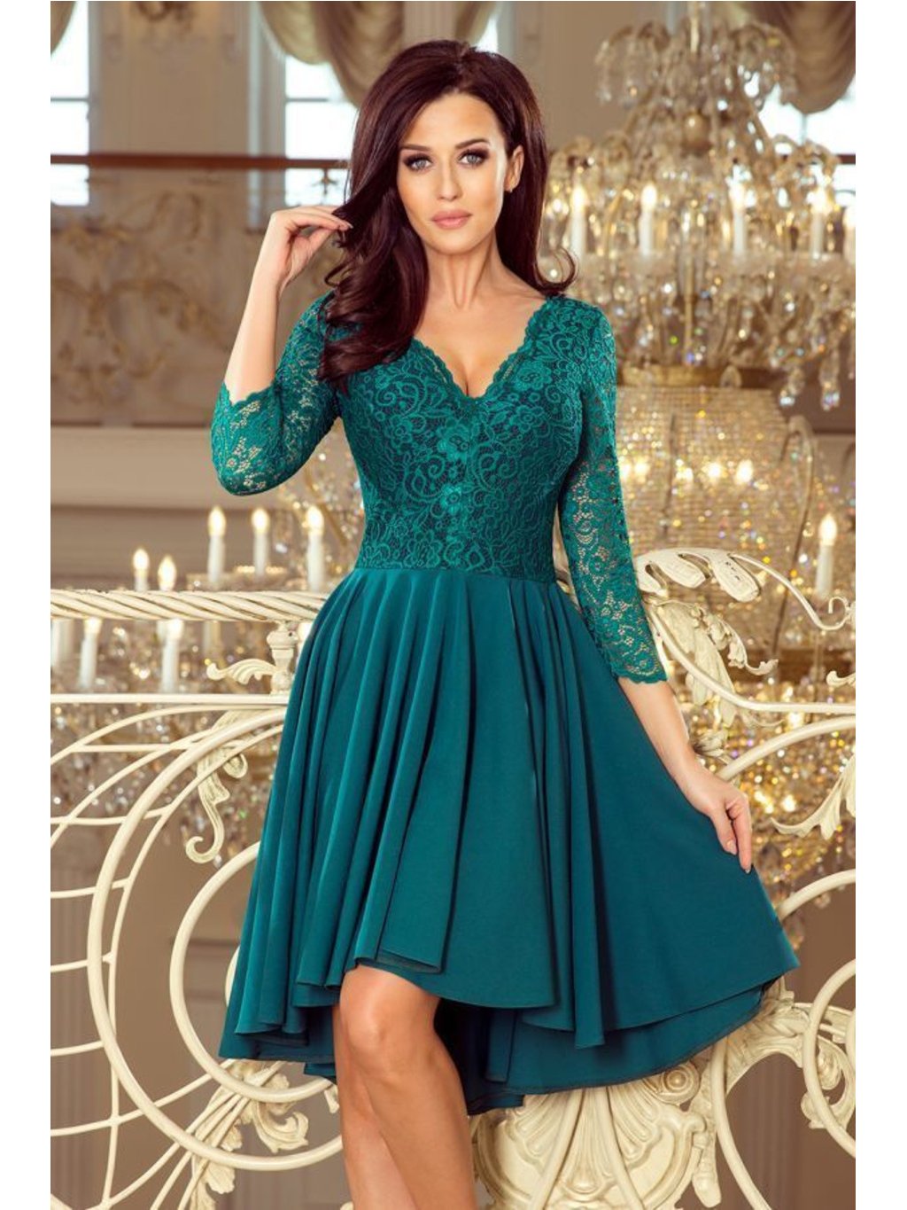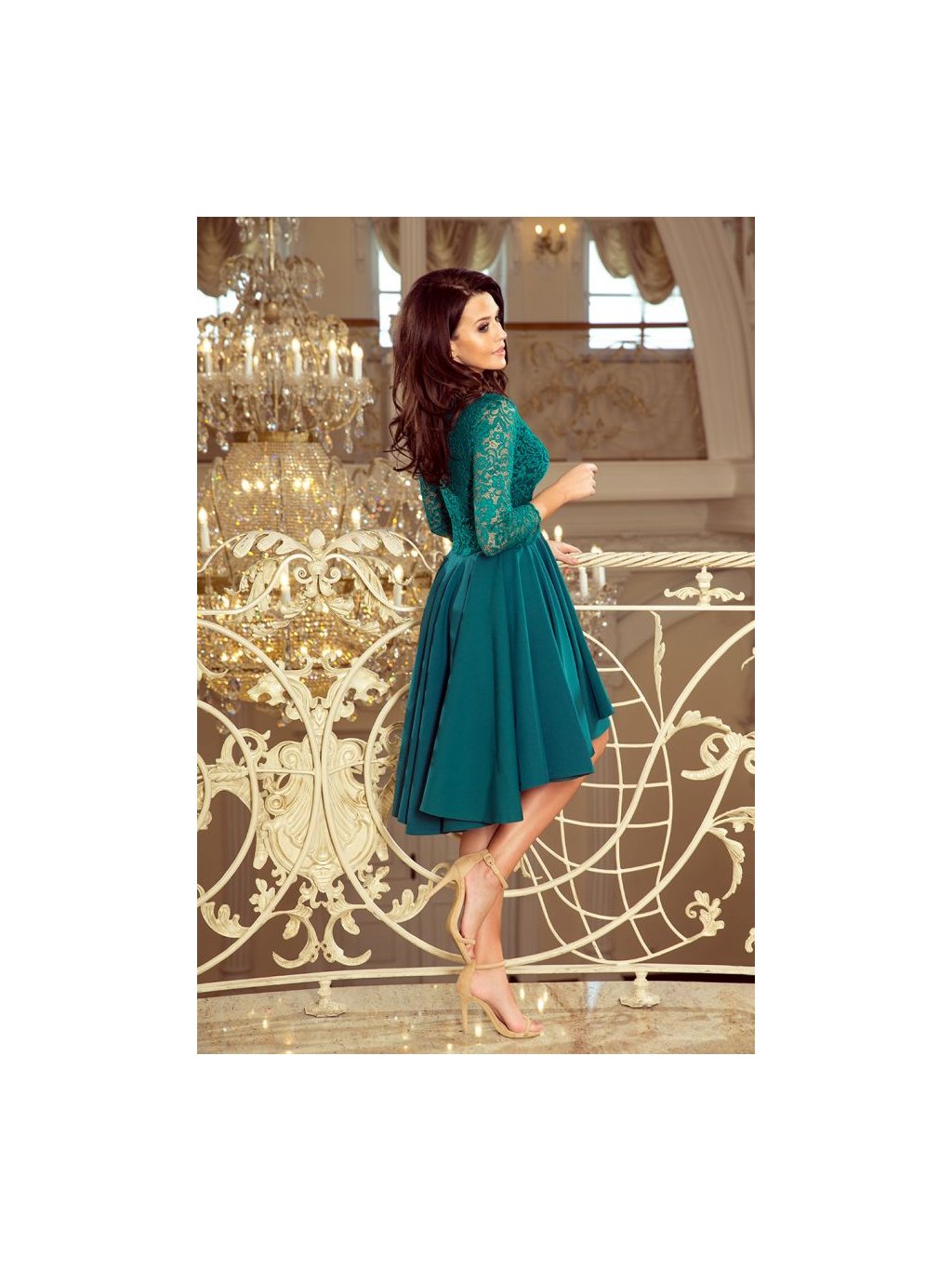 Nicolle - asymetrické exkluzivní šaty s dlouhými zády, 3/4 rukávy, výstřihem a krajkou. Zelená barva. Sukně s delší záda bude ideální pro tanec. Polská produkce. Numoco