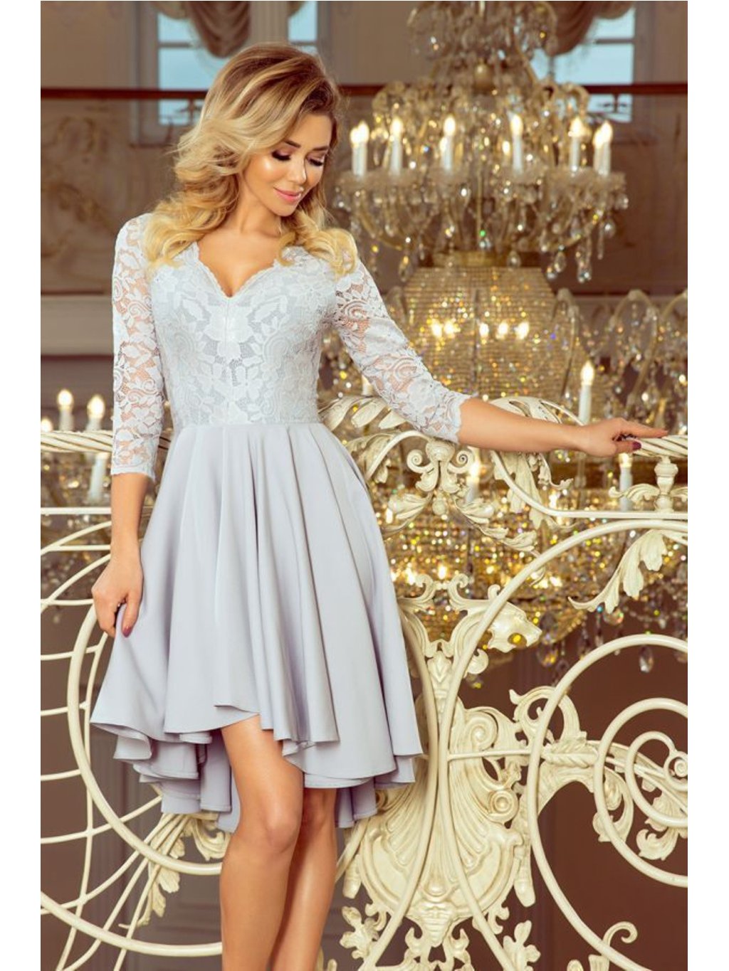 Nicolle - asymetrické exkluzivní šaty s dlouhými zády, 3/4 rukávy, výstřihem a krajkou. Šedá barva. Sukně s delší záda bude ideální pro tanec. Polská produkce. Numoco