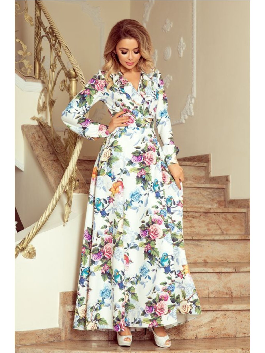 Dlouhé šaty s výstřihem, volánkem a dlouhými rukávy. Vyrobeno z příjemného materiálu na dotek v barevných růžích a modrých ptácích. Produkce Polsko.