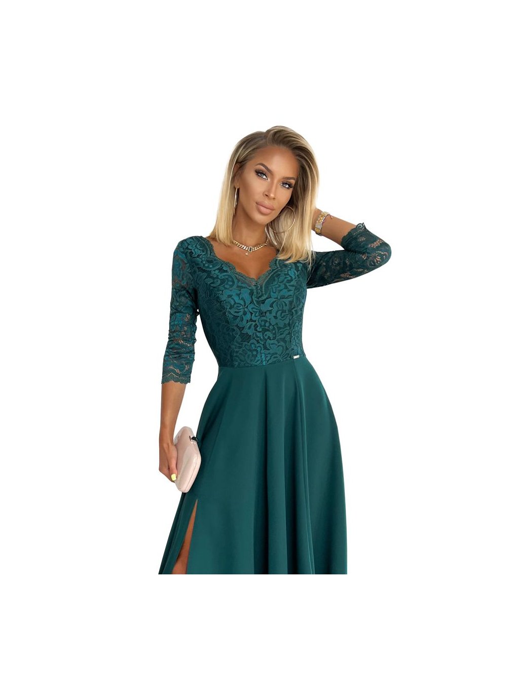 Amber - elegantní dlouhé krajkové šaty s výstřihem. Krásně profilovaný výstřih a střih na sukni vytváří nevšední kreaci v barvě zelené. Polská výroba. Značka Numoco .