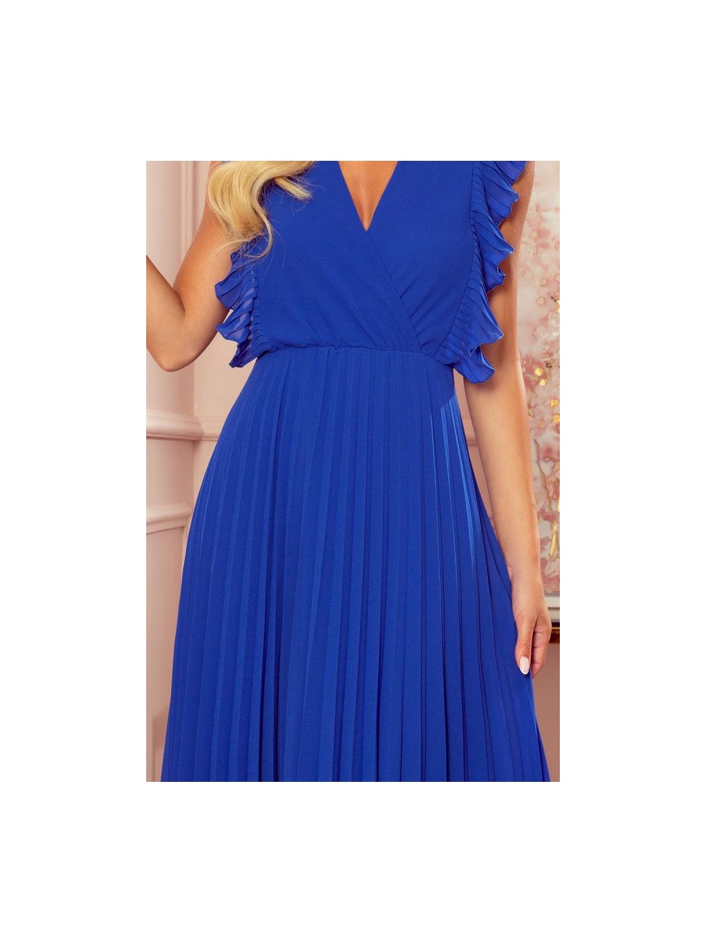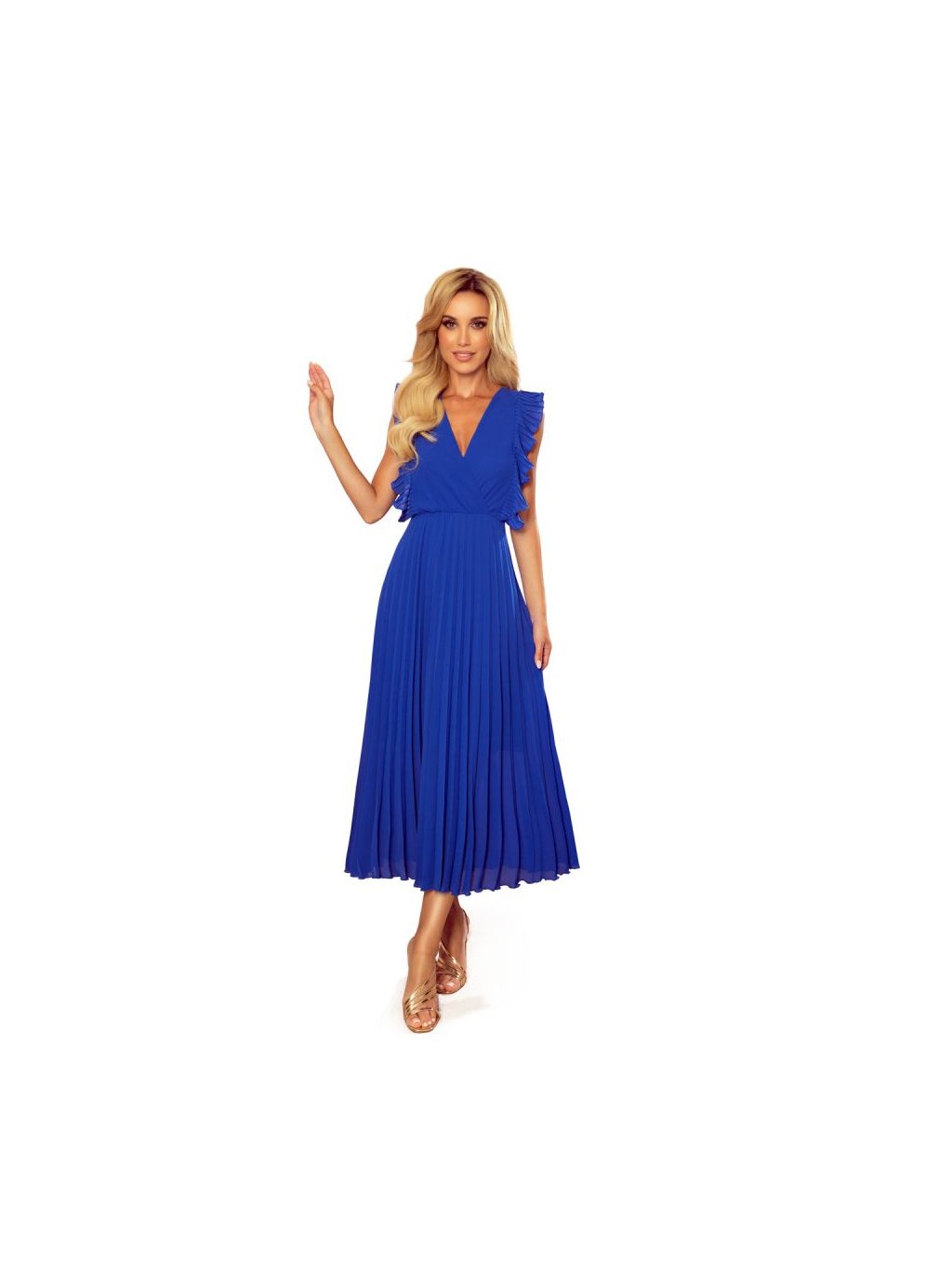 Emily - skládané šifónové šaty s výstřihem a volánky. Sukně byla ušitá v módní délce 7/8. Vzadu se zapíná zakrytým zipem. Barva: modrá. Značka --- polská produkce.