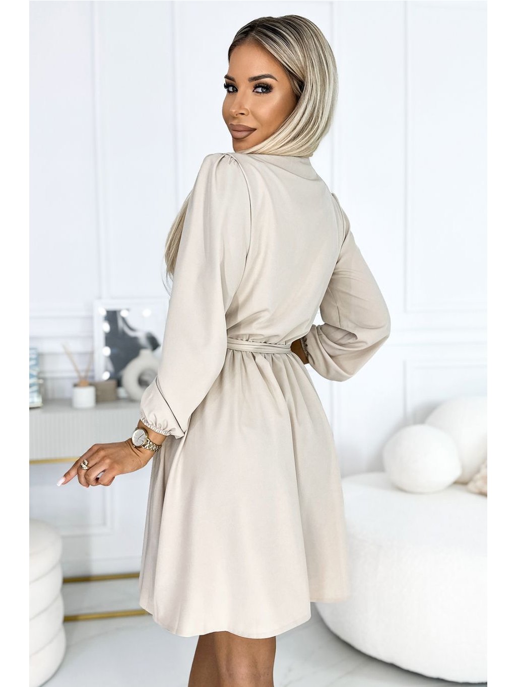 339-4 BINDY Dámské šaty s výstřihem a páskem - béžové
