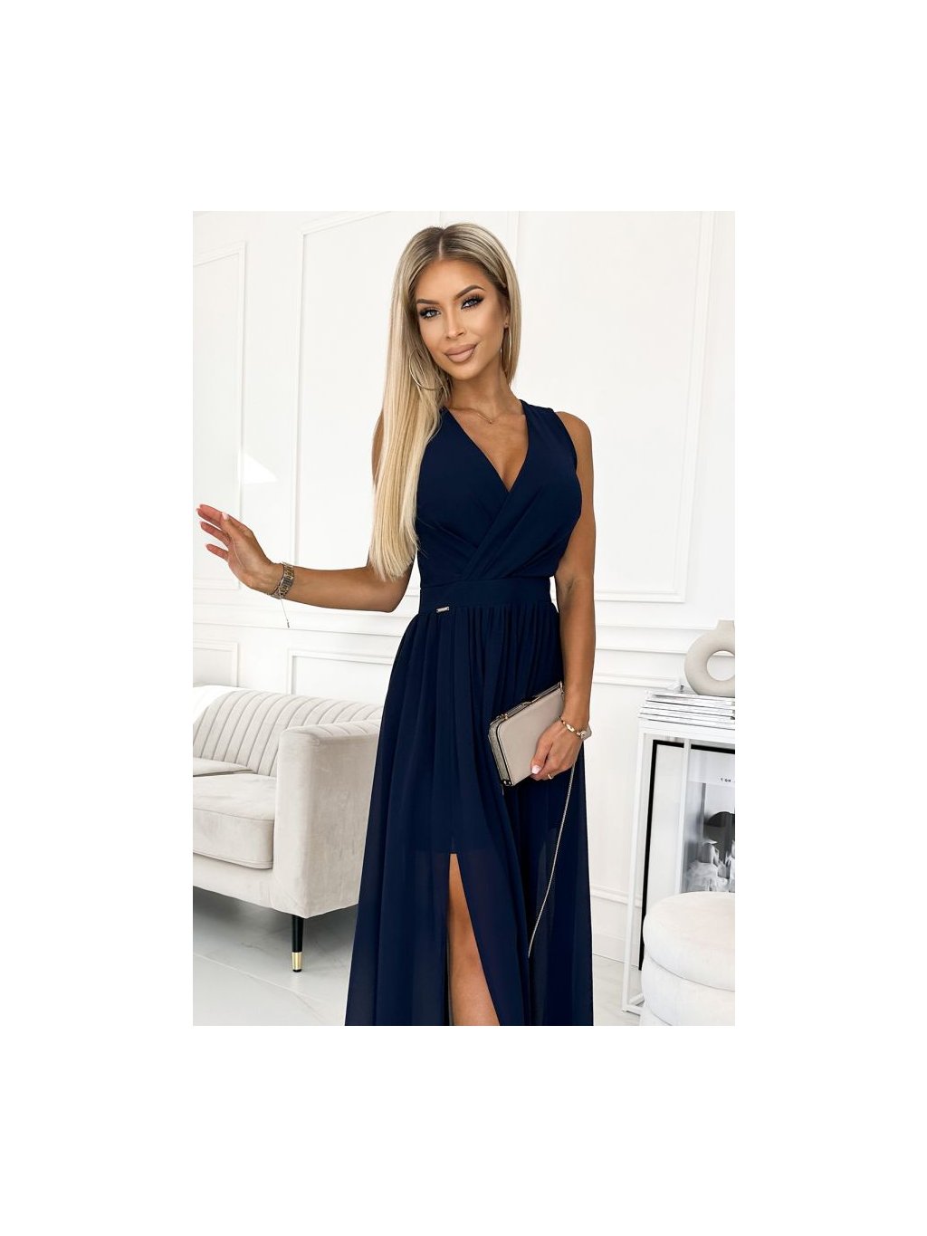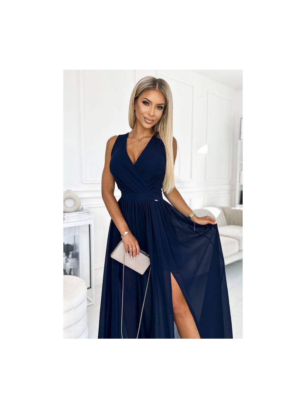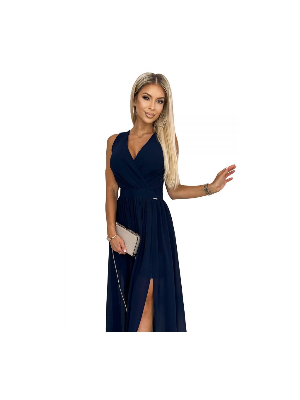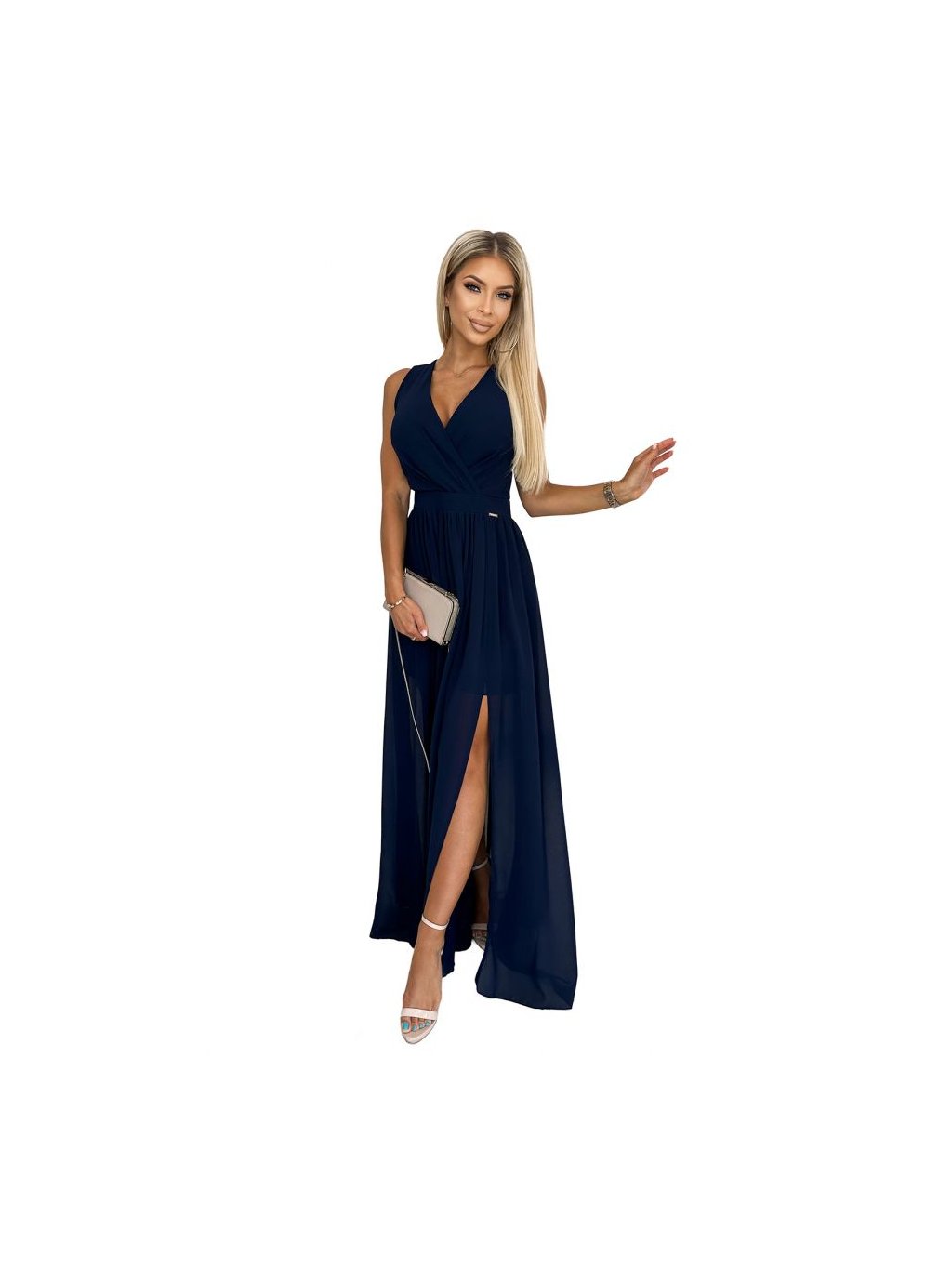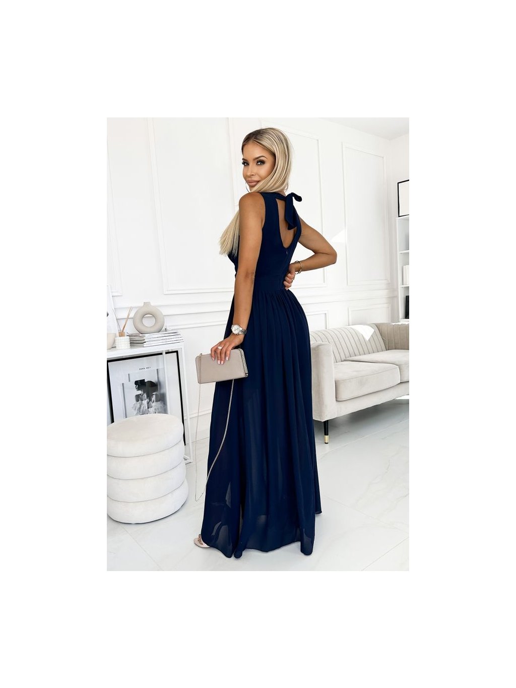 362-7 JUSTINE Dlouhé šaty s výstřihem a zavazováním - tmavě modrá