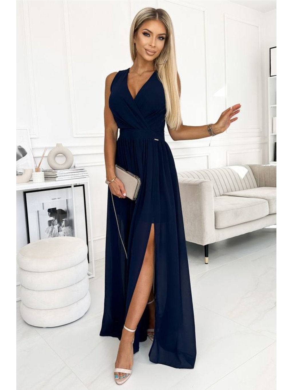 Justine - dlouhé šaty s výstřihem, rozparkem na nohavici a zavazováním na zádech. Vyrobeno ze vzdušného materiálu v tmavě modré barvě. Zapínání vzadu na krytý zip. Polský výrobek. Značka Numoco.