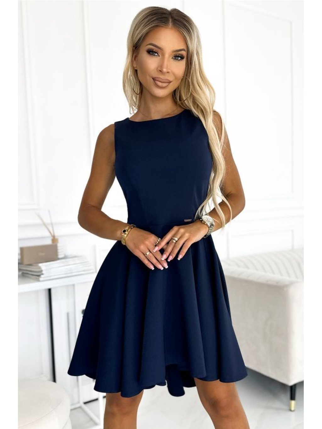 397-2 Elegantní šaty s delším zadním dílem - tmavě modrá