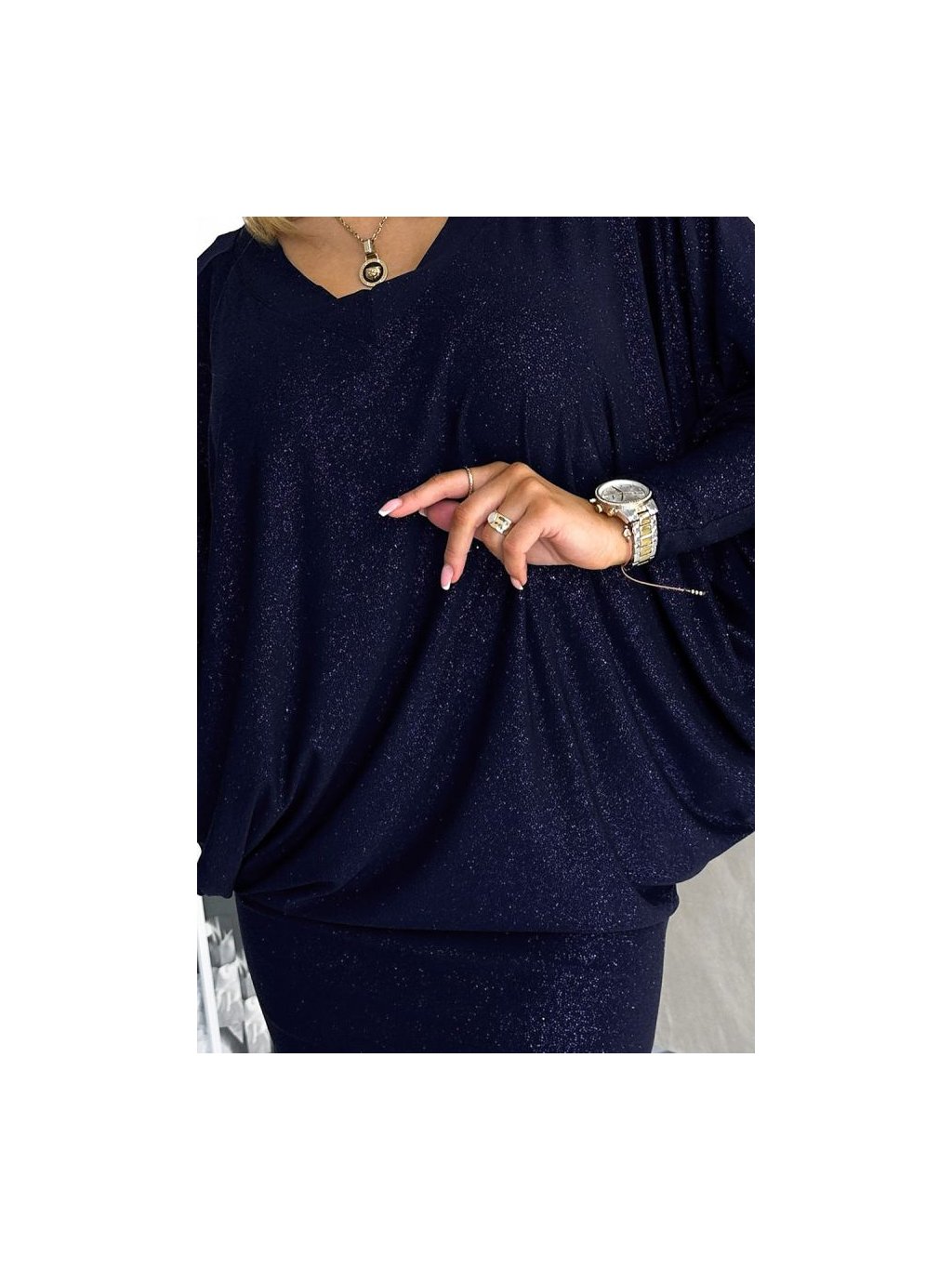 Netopýří šaty s výstřihem. Vyrobeno z elastického materiálu se třpytkami. Tmavě modrá barva. Značka Numoco . Polská výroba.