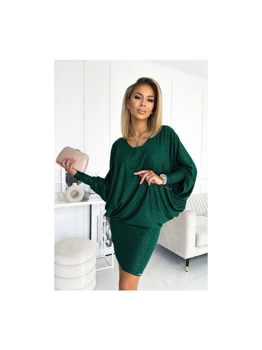 Netopýří šaty s výstřihem. Vyrobeno z elastického materiálu se třpytkami. Zelená barva. Značka Numoco . Polská výroba.