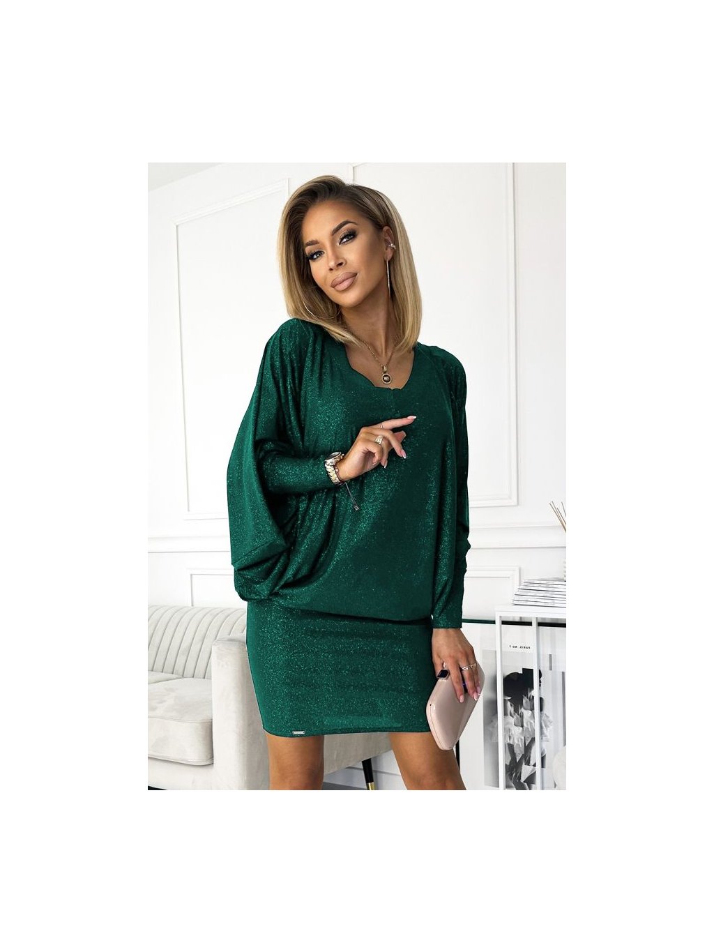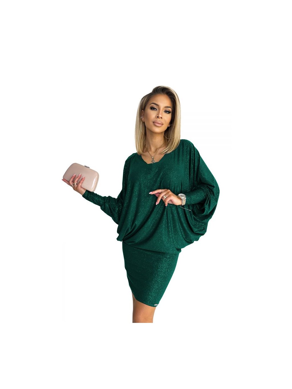 402-2 Netopýří šaty s výstřihem - zelené se třpytkami
