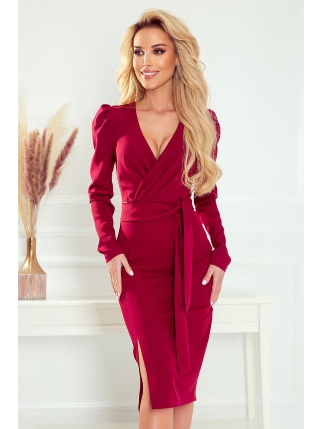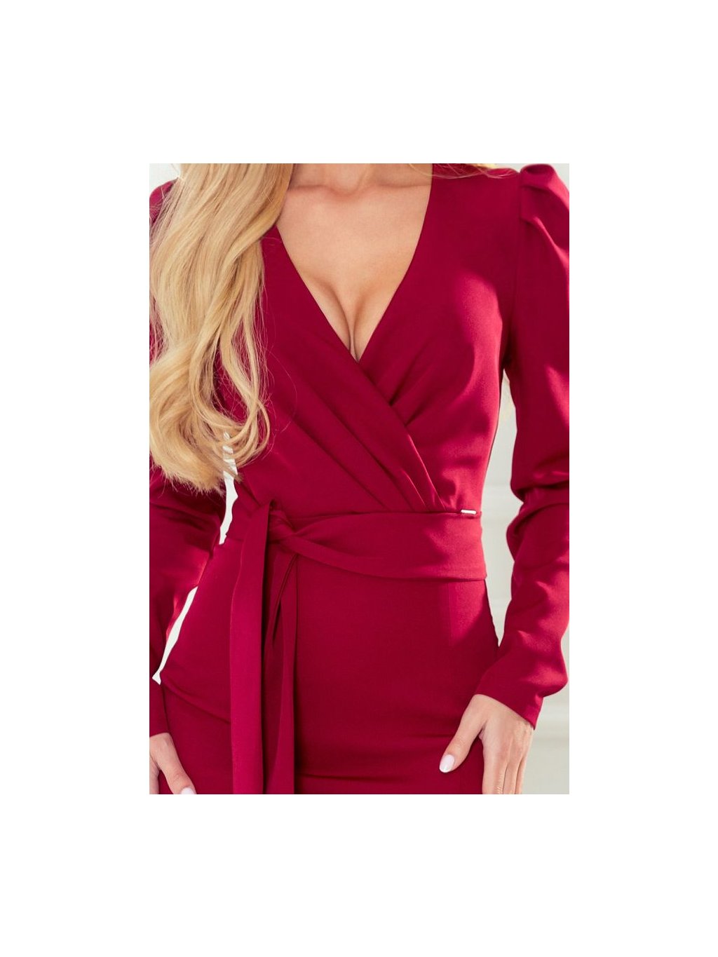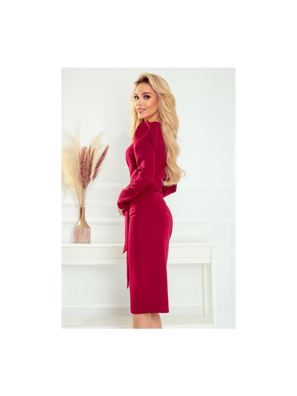 EDITTA - elegantní šaty s výstřihem, dlouhým rukávem, páskem a nabíračkami na ramenou. Vyrobeno z materiálu příjemného na dotek v módní vínové barvě. Polský výrobek. Značka Numoco.