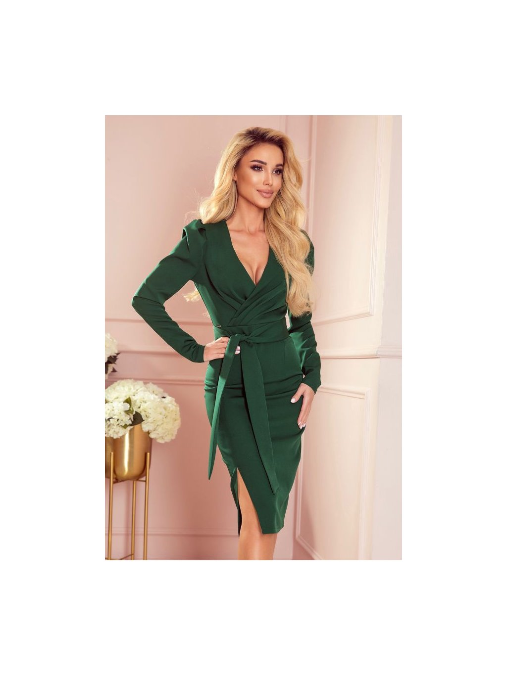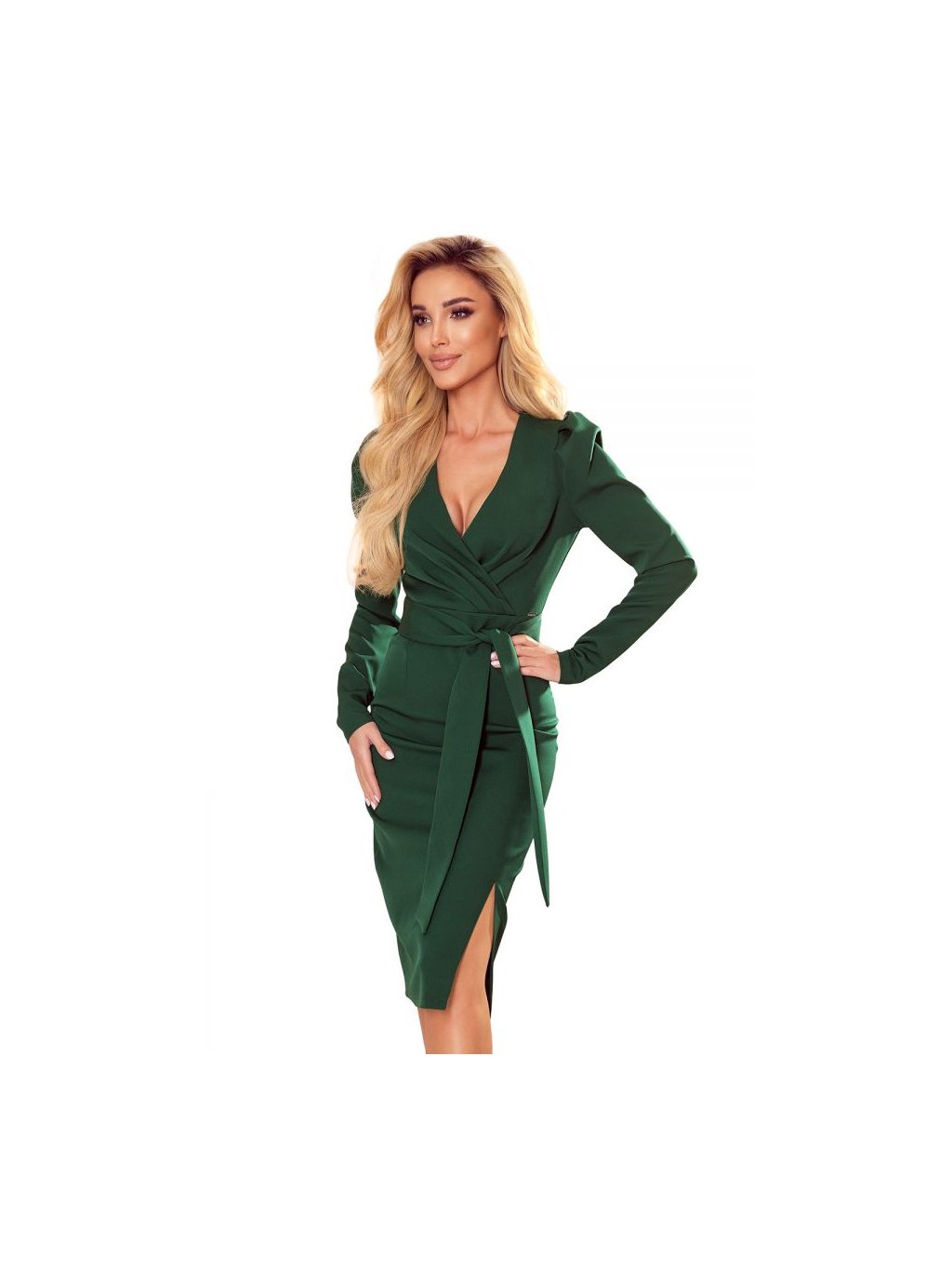EDITTA - elegantní šaty s výstřihem, dlouhými rukávy, páskem a nabírkami na ramenou. Vyrobeno z materiálu příjemného na dotek v módní zelené barvě. Polský výrobek. Značka Numoco .