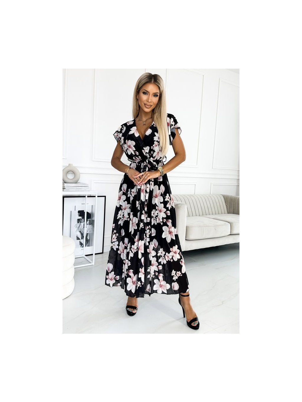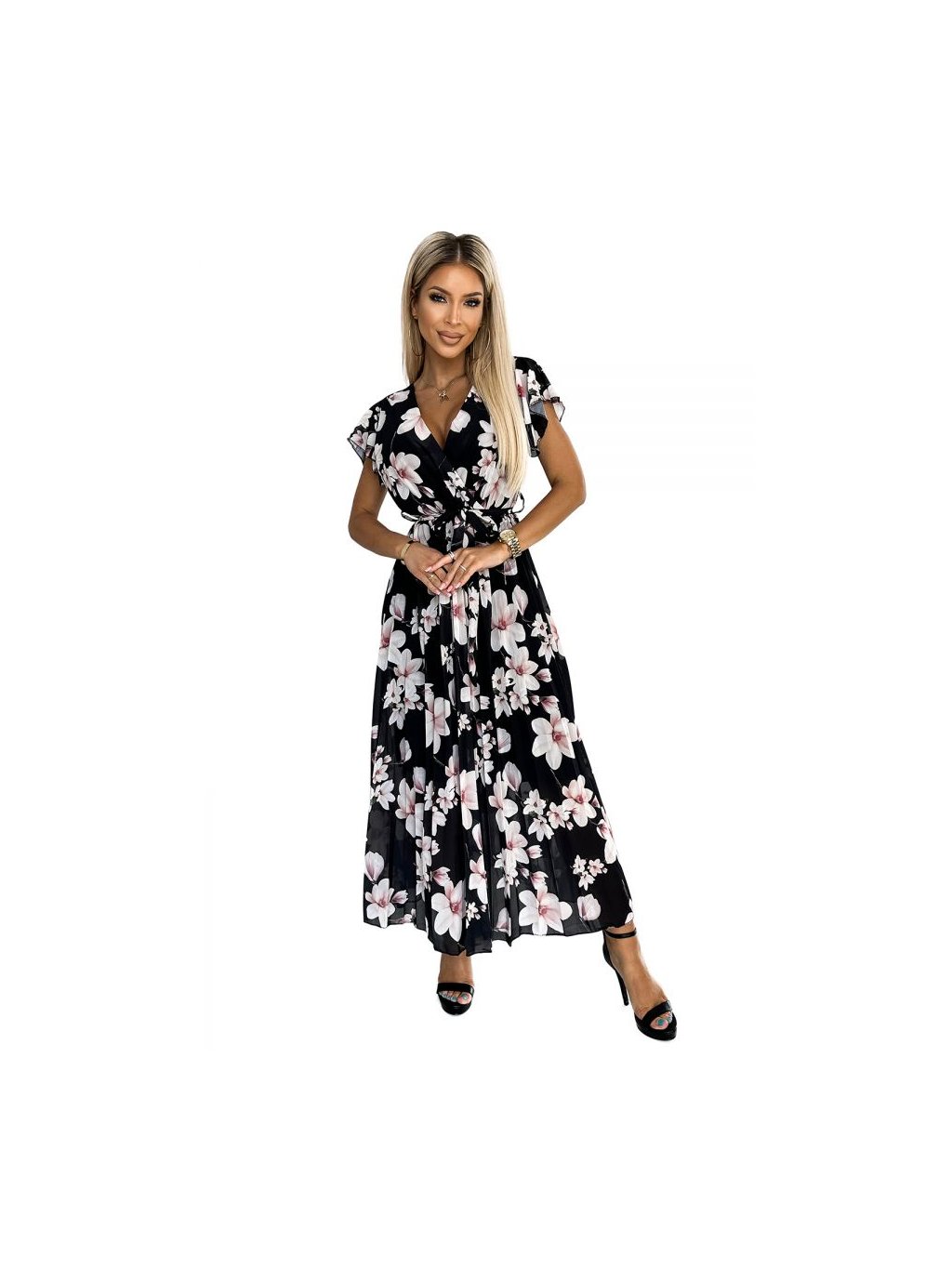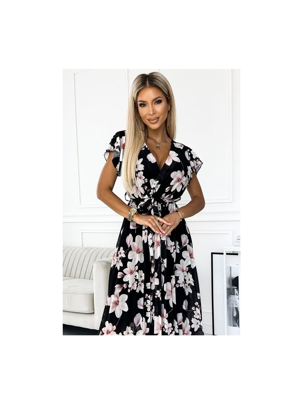Lisa - šifonové midi šaty s výstřihem a volány na ramenou. Vzor: broskvový květ na černém pozadí. Značka Numoco. evropská produkce.