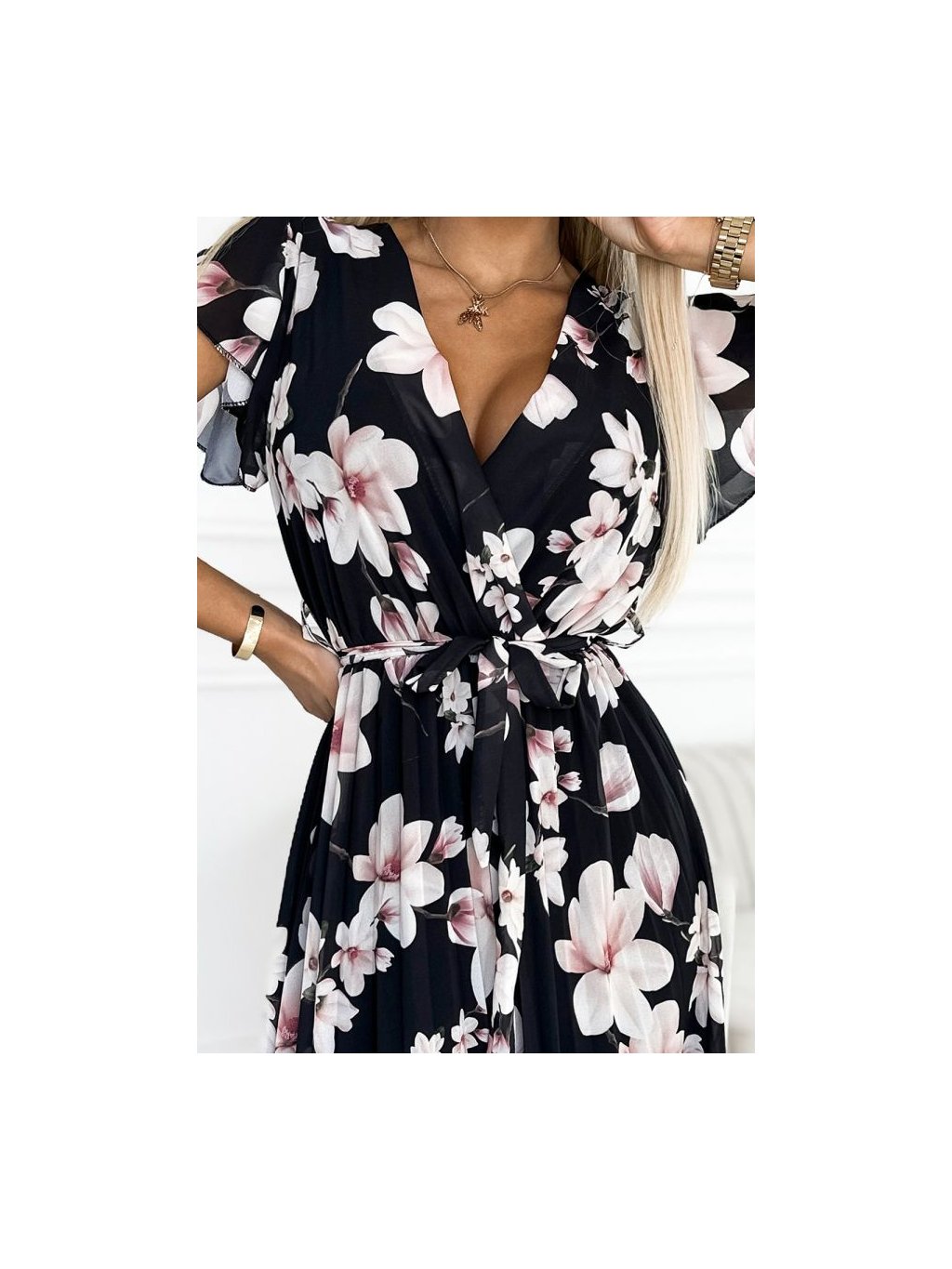 434-1 LISA Plisované midi šaty s výstřihem a volánky - broskvový květ na černém pozadí