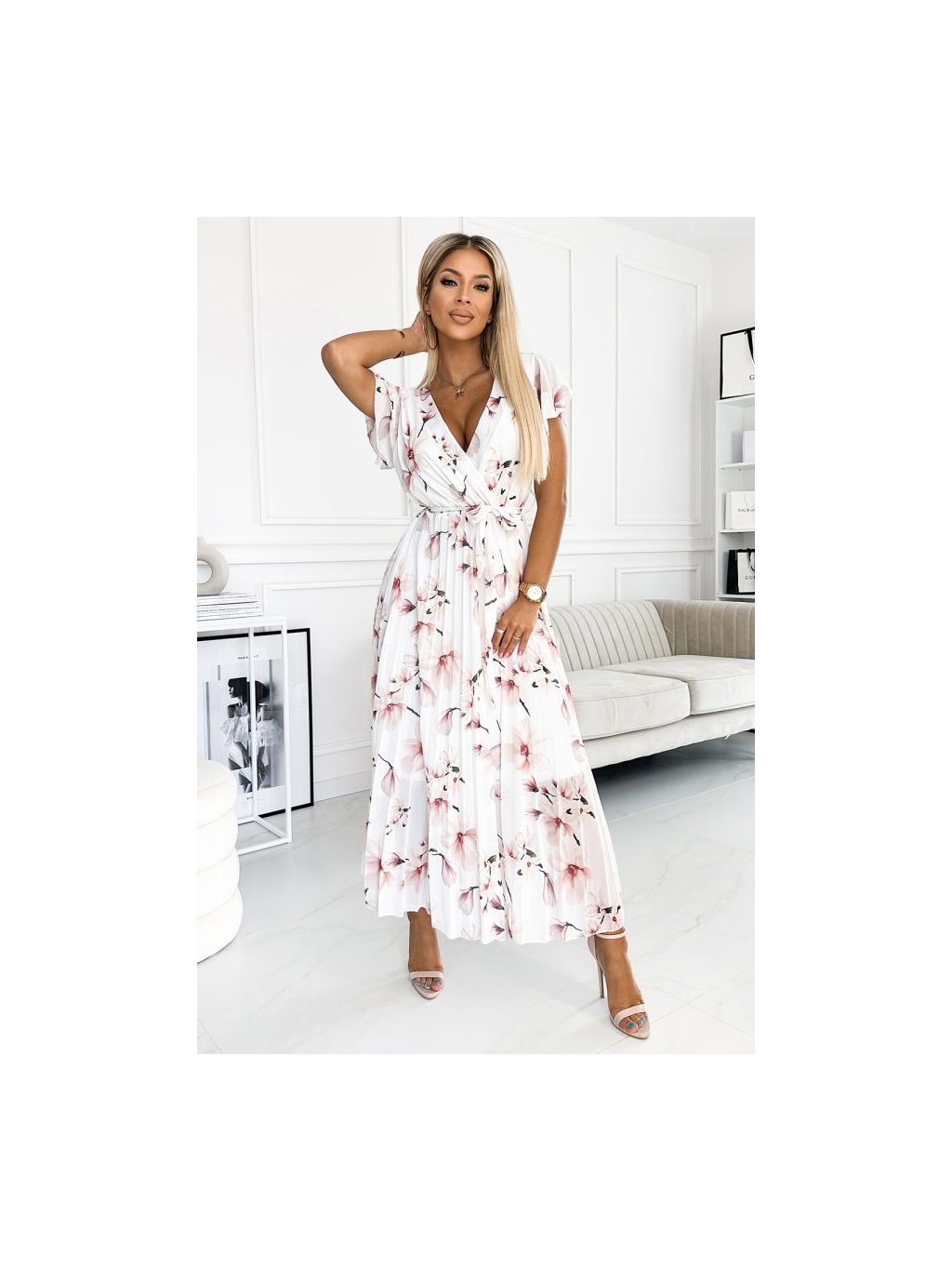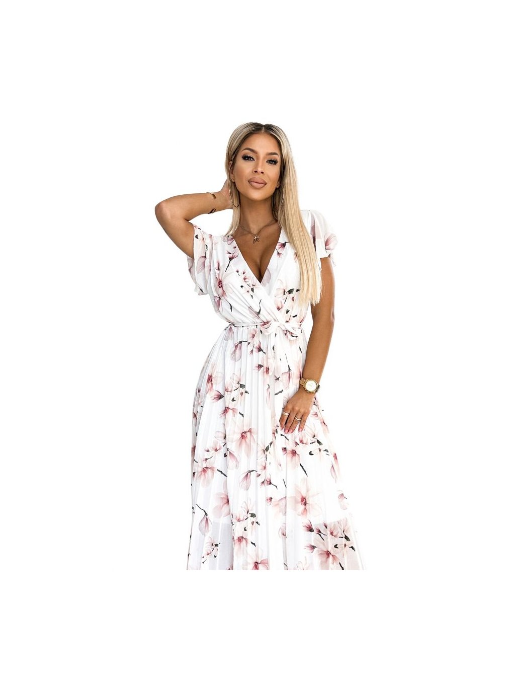 434-4 LISA Plisované midi šaty s výstřihem a volánky - broskvový květ na bílém pozadí