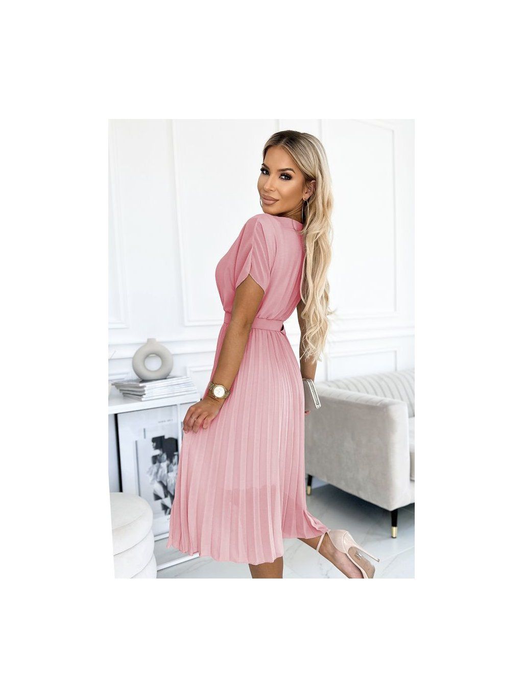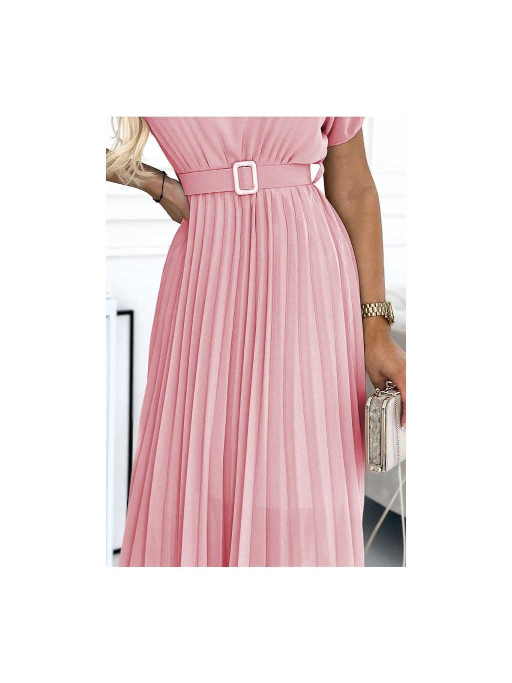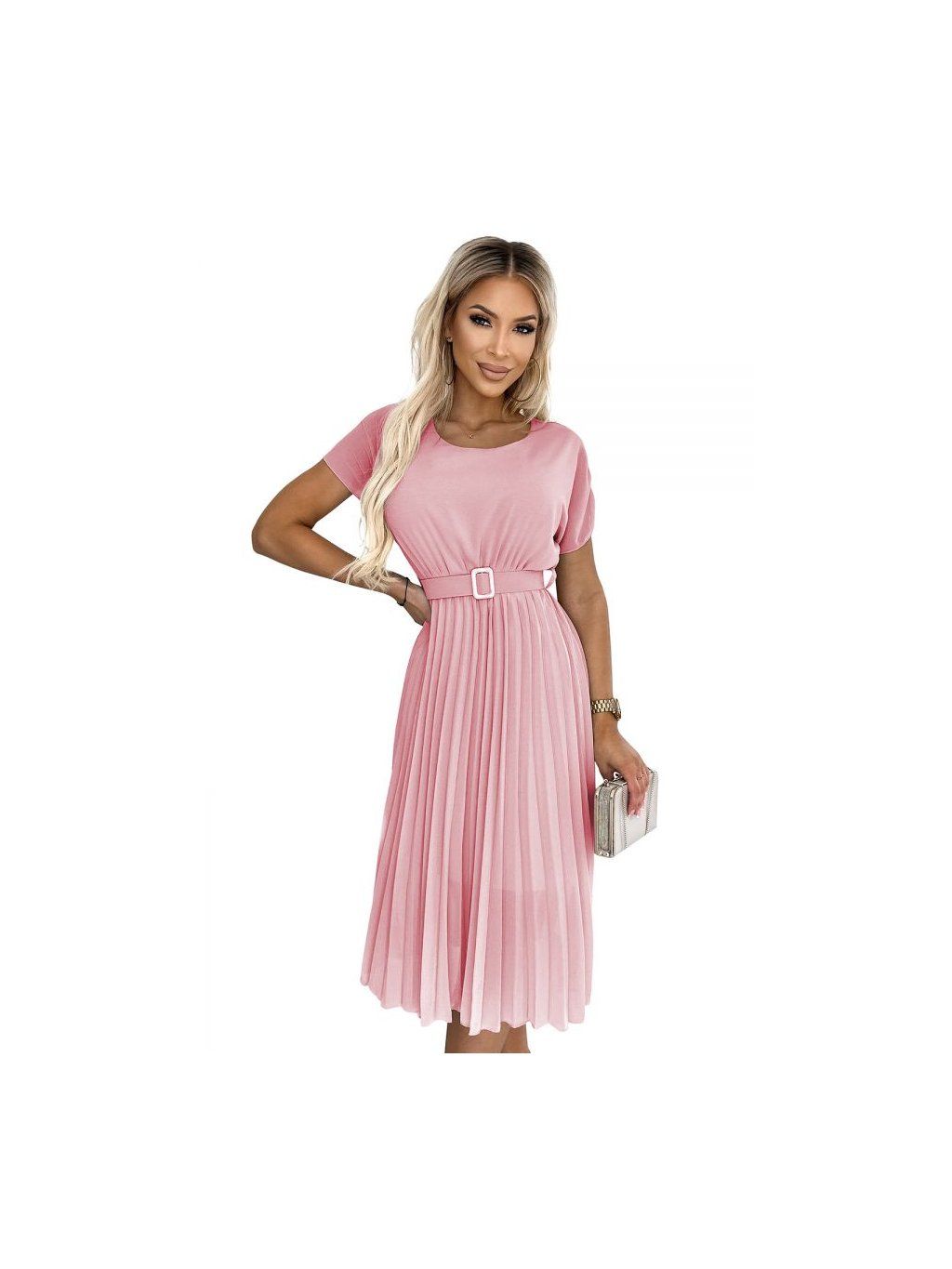465-3 MIA Plisované midi šaty se širokým páskem - špinavě růžové NMC-465-3/DR