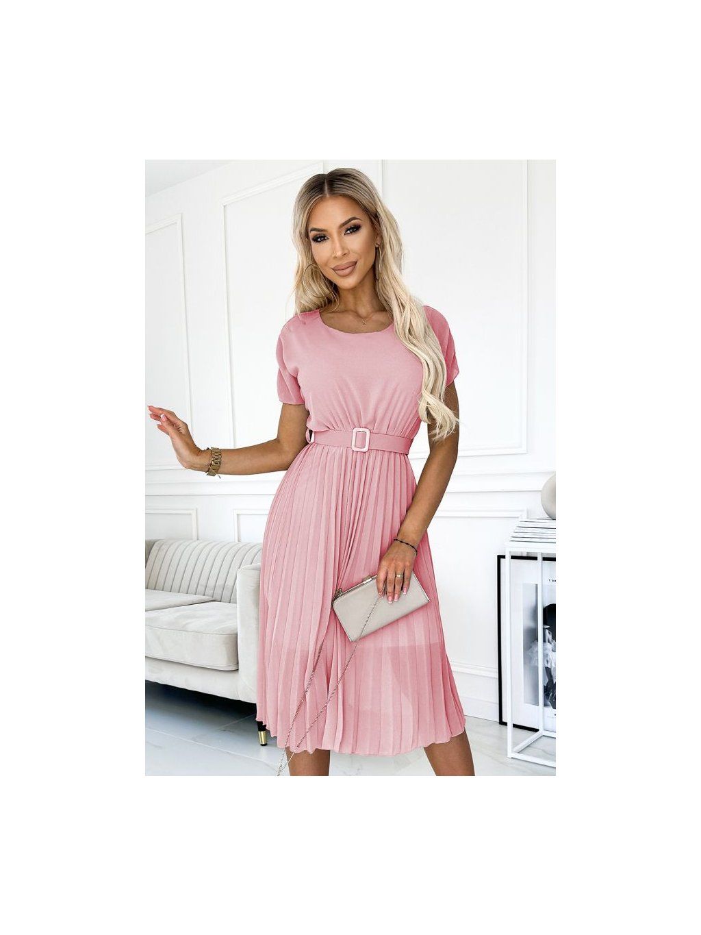 Plisované šaty MIA s kulatým výstřihem, širokým páskem a krátkými rukávy.