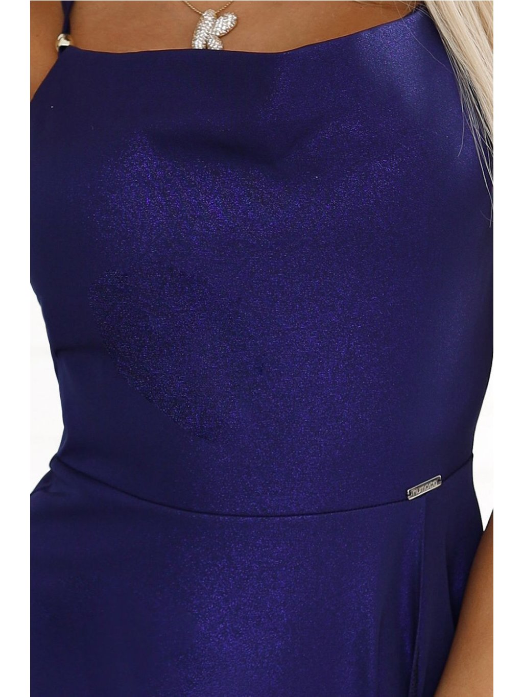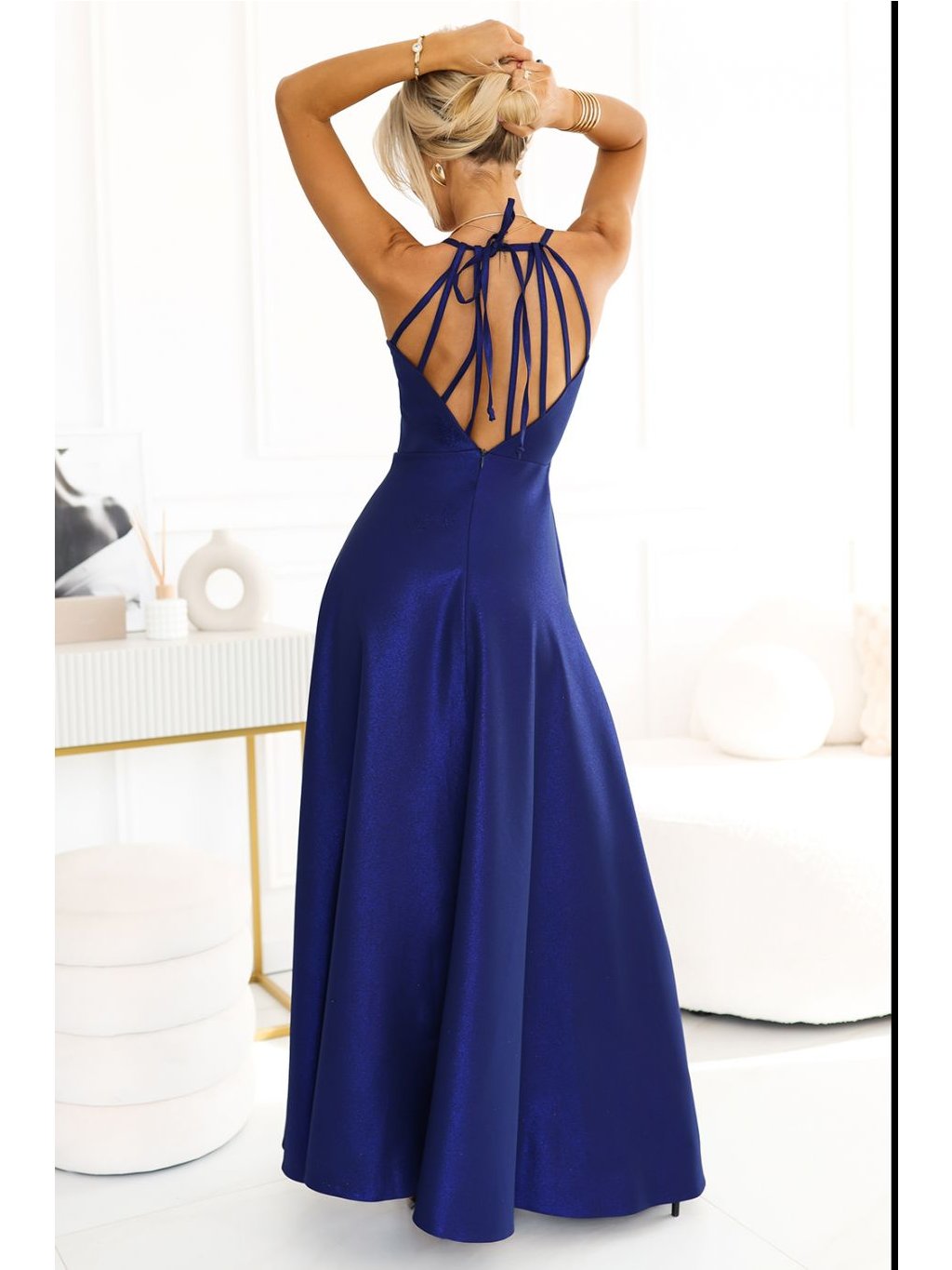 Dlouhé třpytivé šaty s exkluzivním zavazováním na zádech - tmavě modrá