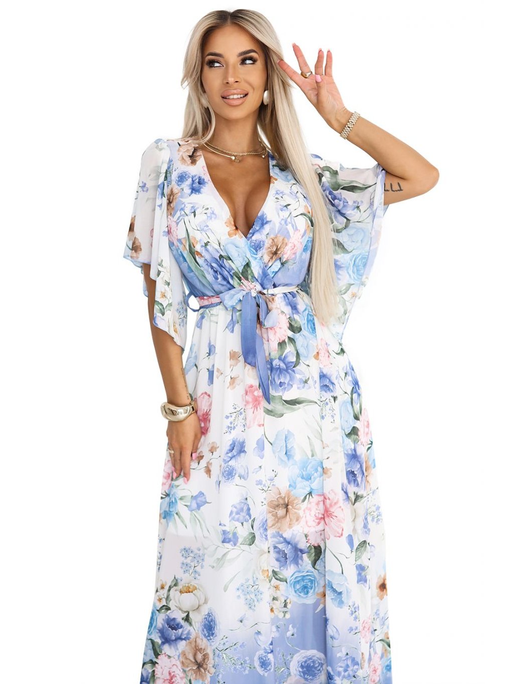 603-3 Vzdušné zavinovací maxi šaty s květinovým vzorem – modré růže