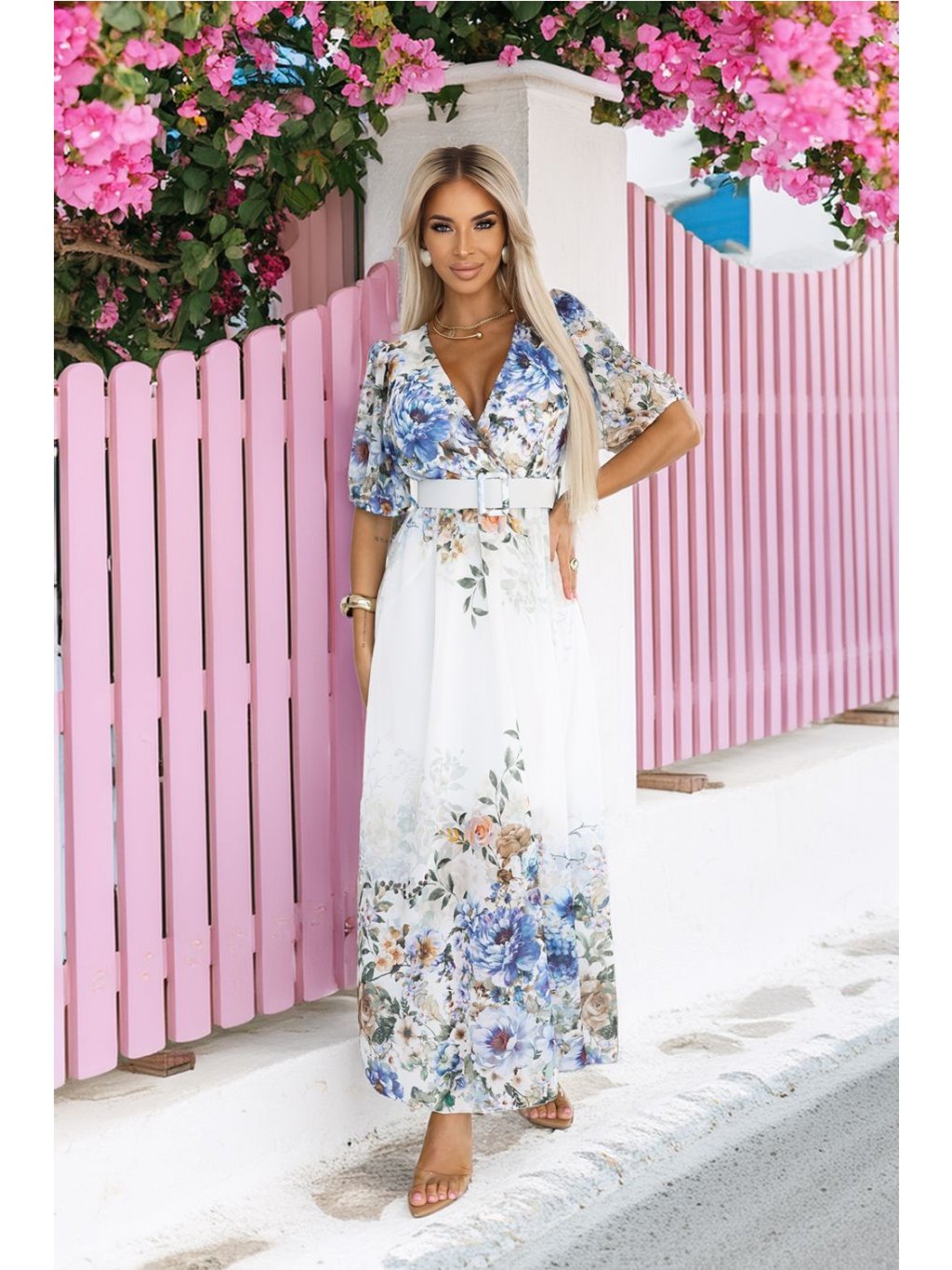Dlouhé maxi šaty s květinovým potiskem a jemným ombré efektem jsou perfektní volbou na léto, dovolenou, zahradní párty nebo romantickou večeři. Zavinovací výstřih krásně zdůrazňuje poprsí, zatímco pásek tvaruje siluetu a zajišťuje ženský vzhled.