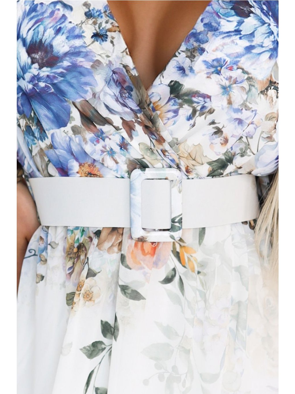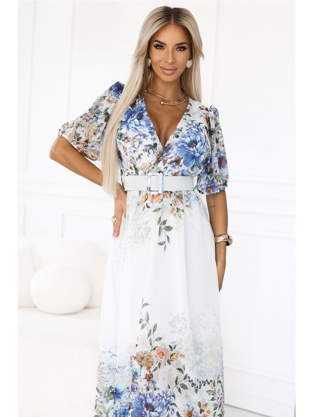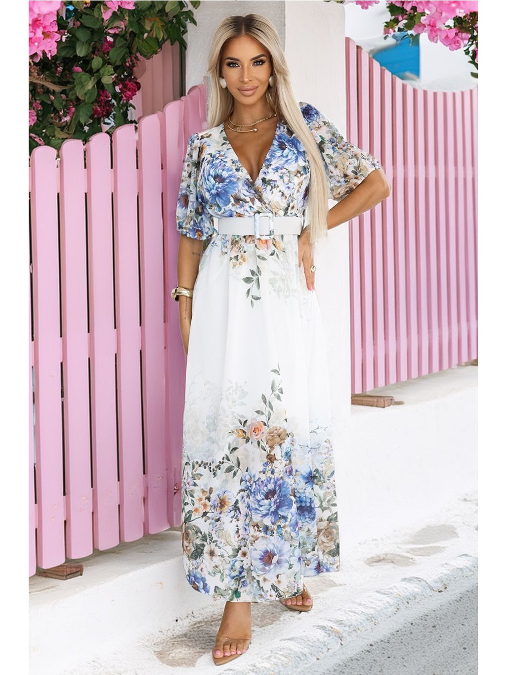 613-1 CELINA Vzdušné maxi šaty s výstřihem do V, páskem a květinovým ombré vzorem - světle modré