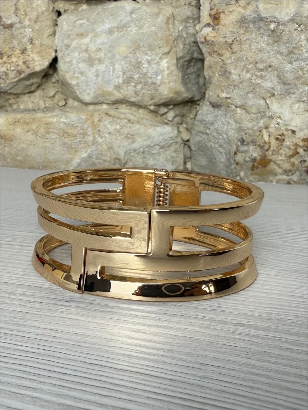 Elegantní módní náramek ve zlatém odstínu. Výrazný a luxusně působící doplněk, který krásně vynikne na ruce. Pevné zapínání, velmi pěkný stav. Skvělý na společenské události i k oživení jednoduchého outfitu.