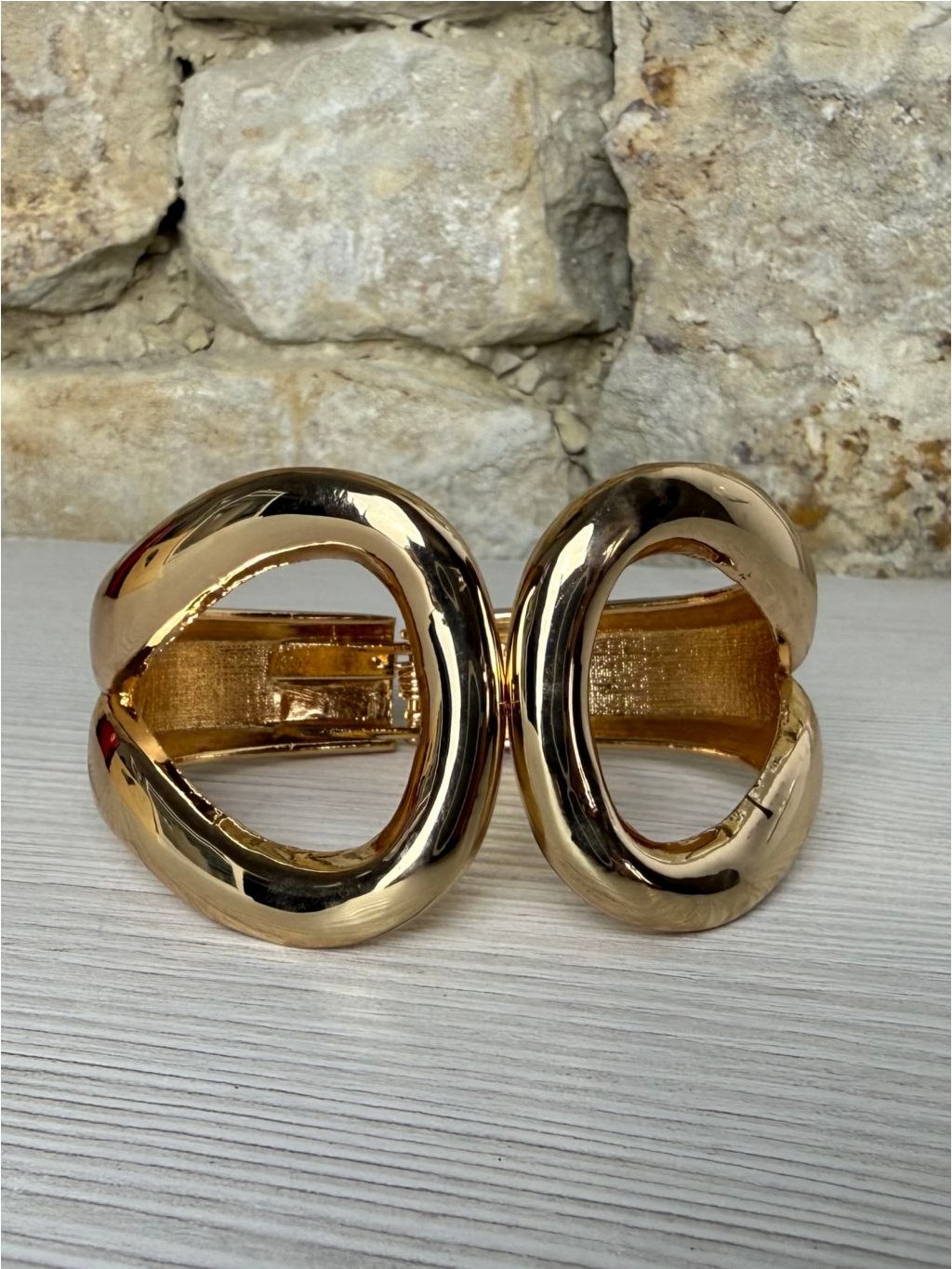 Elegantní módní náramek ve zlatém odstínu. Výrazný a luxusně působící doplněk, který krásně vynikne na ruce. Pevné zapínání, velmi pěkný stav. Skvělý na společenské události i k oživení jednoduchého outfitu.