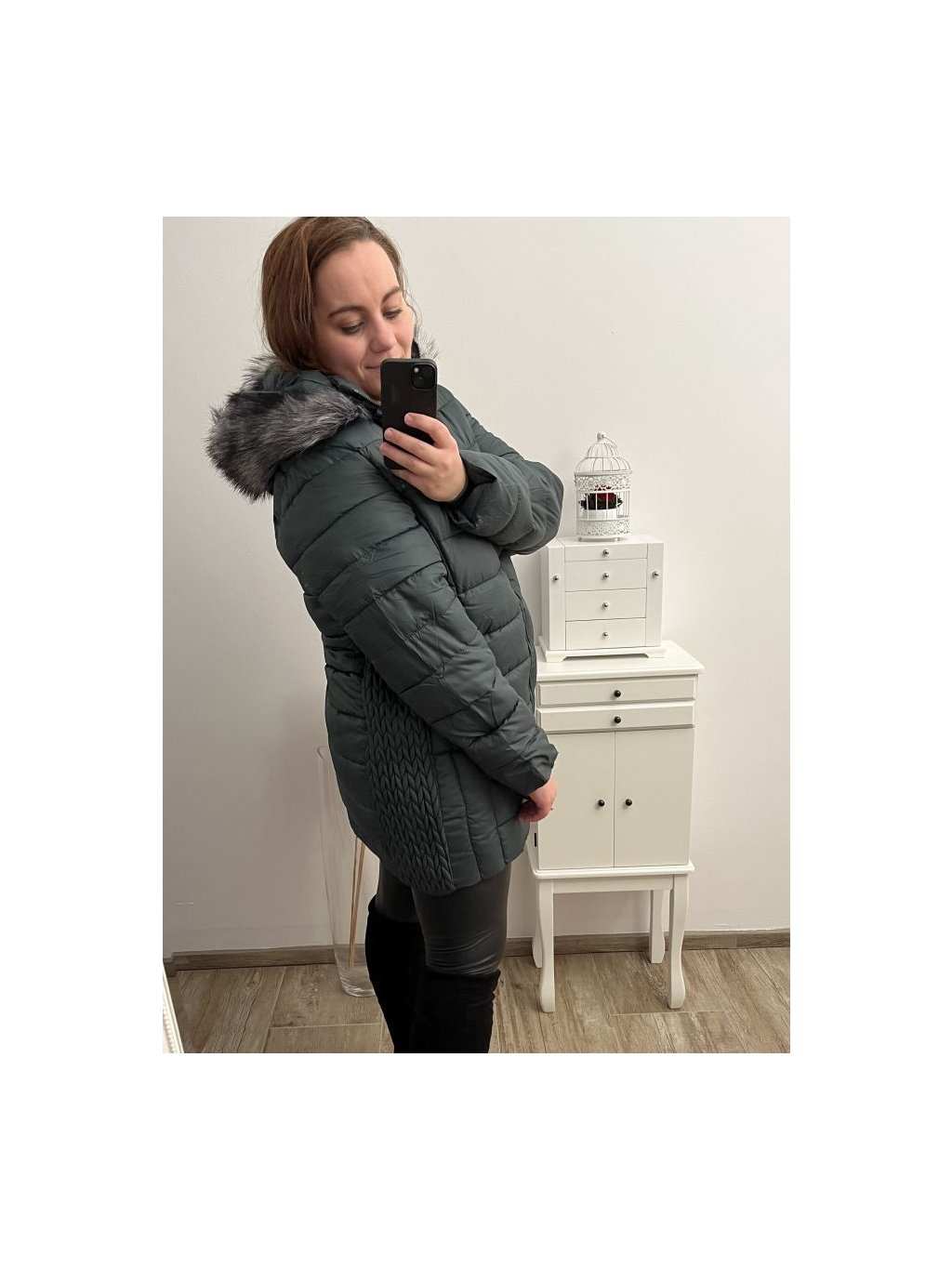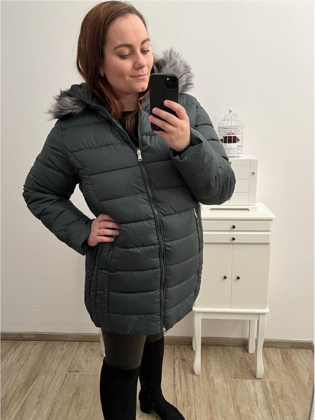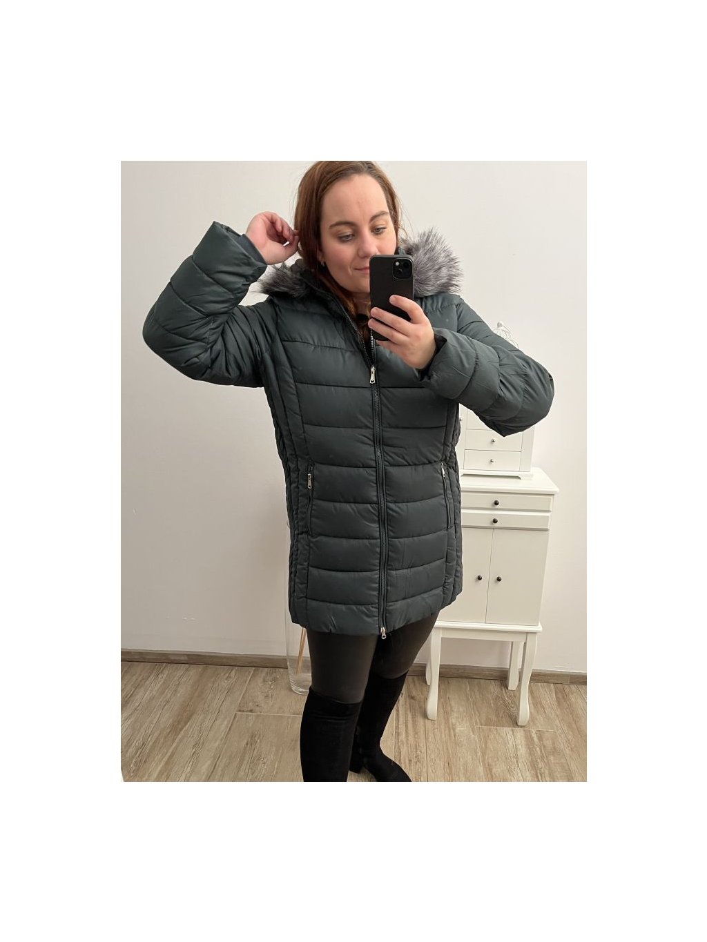 Zimní dámská bunda s kapucí zdobená kožíškem. Prošívaná, není již zateplená žádnou podšívkou.