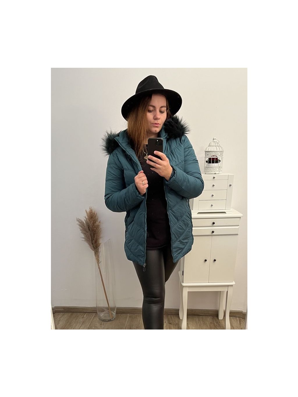 Zimní dámská bunda s kapucí zdobená kožíškem.