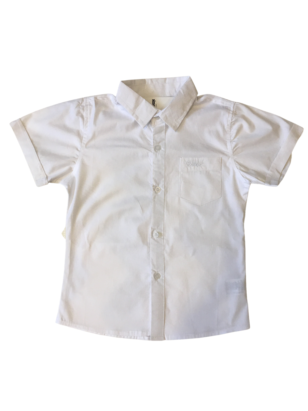 Chlapecká bavlněná společenská košile s krátkým rukávem. Zapínání na knoflíčky. Náprsní kapsa s výšivkou. Lehce projmutá. Vhodná na svatby, oslavy, focení, do divadla i do školy.