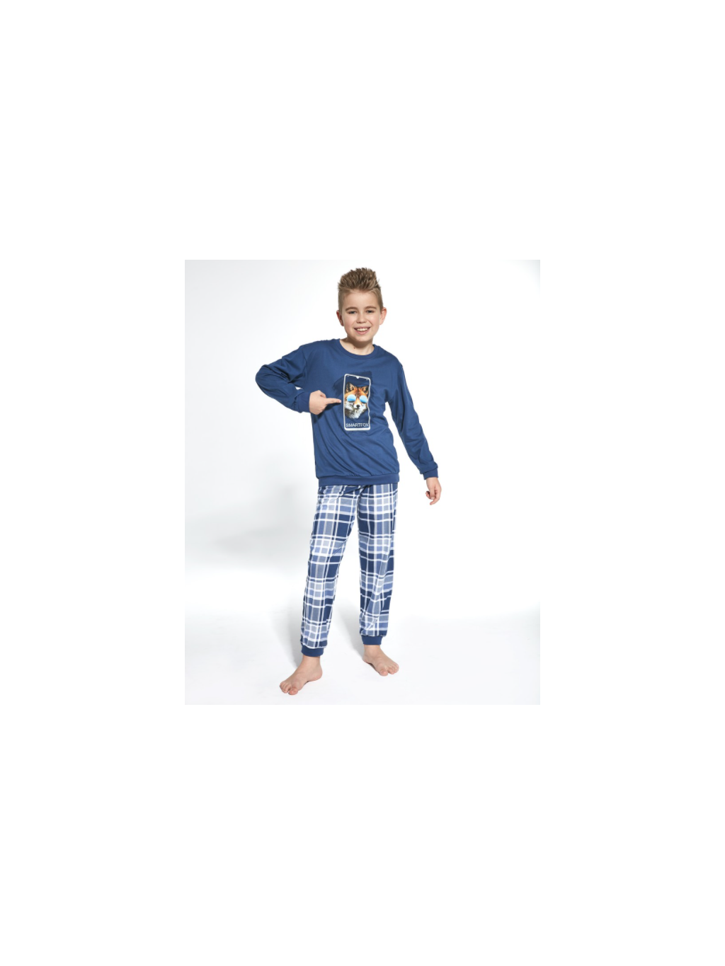 chlapecké pyžamo Cornette 966/107 Smartfox. Pohodlné chlapecké pyžamo vyrobené z vysoce kvalitní a měkké bavlny. Tričko s dlouhým rukávem, vpředu zdobené jemným potiskem. Pohodlné vzorované kalhoty v nohavicích ukončené manžetovým úpletem. Baleno v dárkové krabičce.