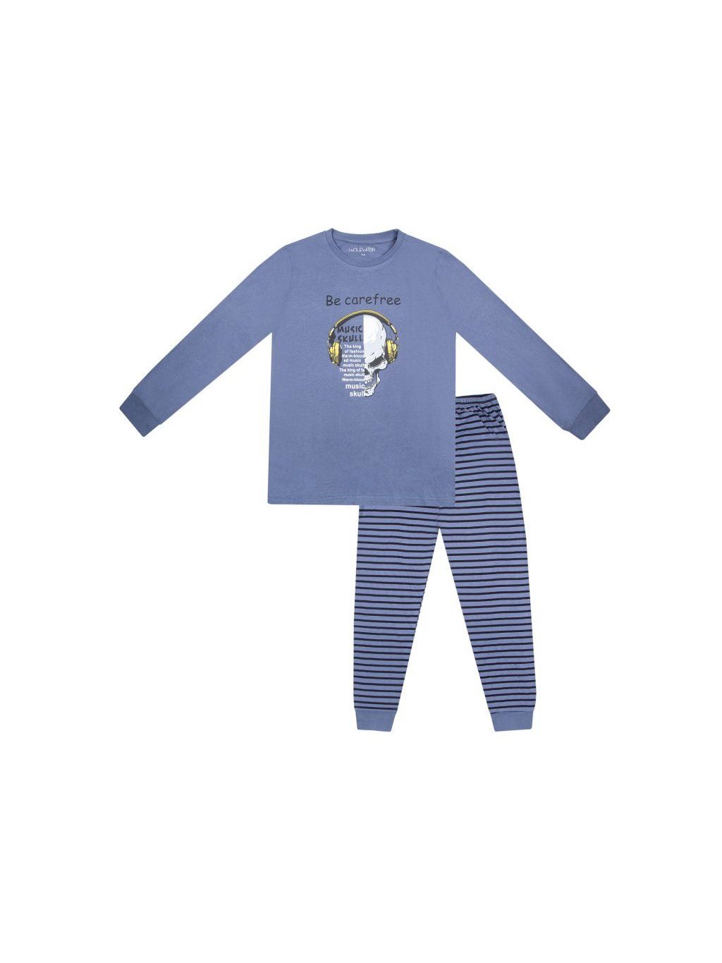 Chlapecké pyžamo značky Wolf je vyrobeno z 100% bavlny. Je příjemné na nošení a prodyšné. Triko má vpředu decentní potisk sluchátek s lebkou. Kalhoty jsou dole do manžetky.
