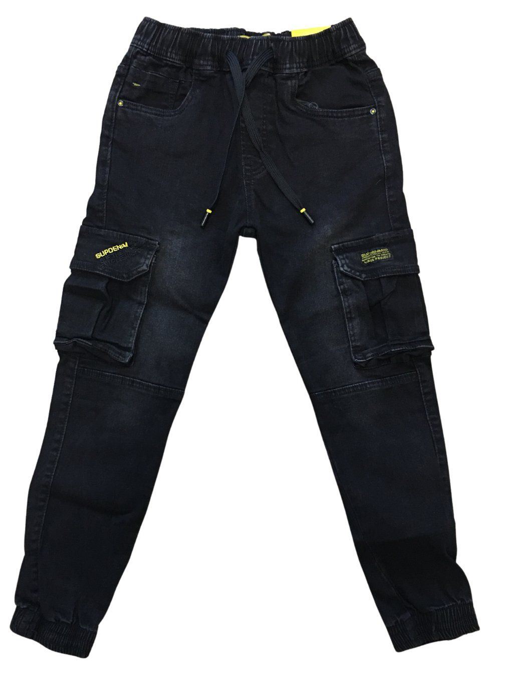 Chlapecké dlouhé kalhoty rifle, v pase do pružné gumy, navíc šňůrky ke stažení, nohavice do rantlu, boční kapsy, kapsy na nohavících, kapsy na zadku. Nápisy prošívané žlutou a černou nití. Pružné, strečové. Užší strih. Vhodné do školních lavic, do města ale i na výlet. Jsou velmi pohodlné.