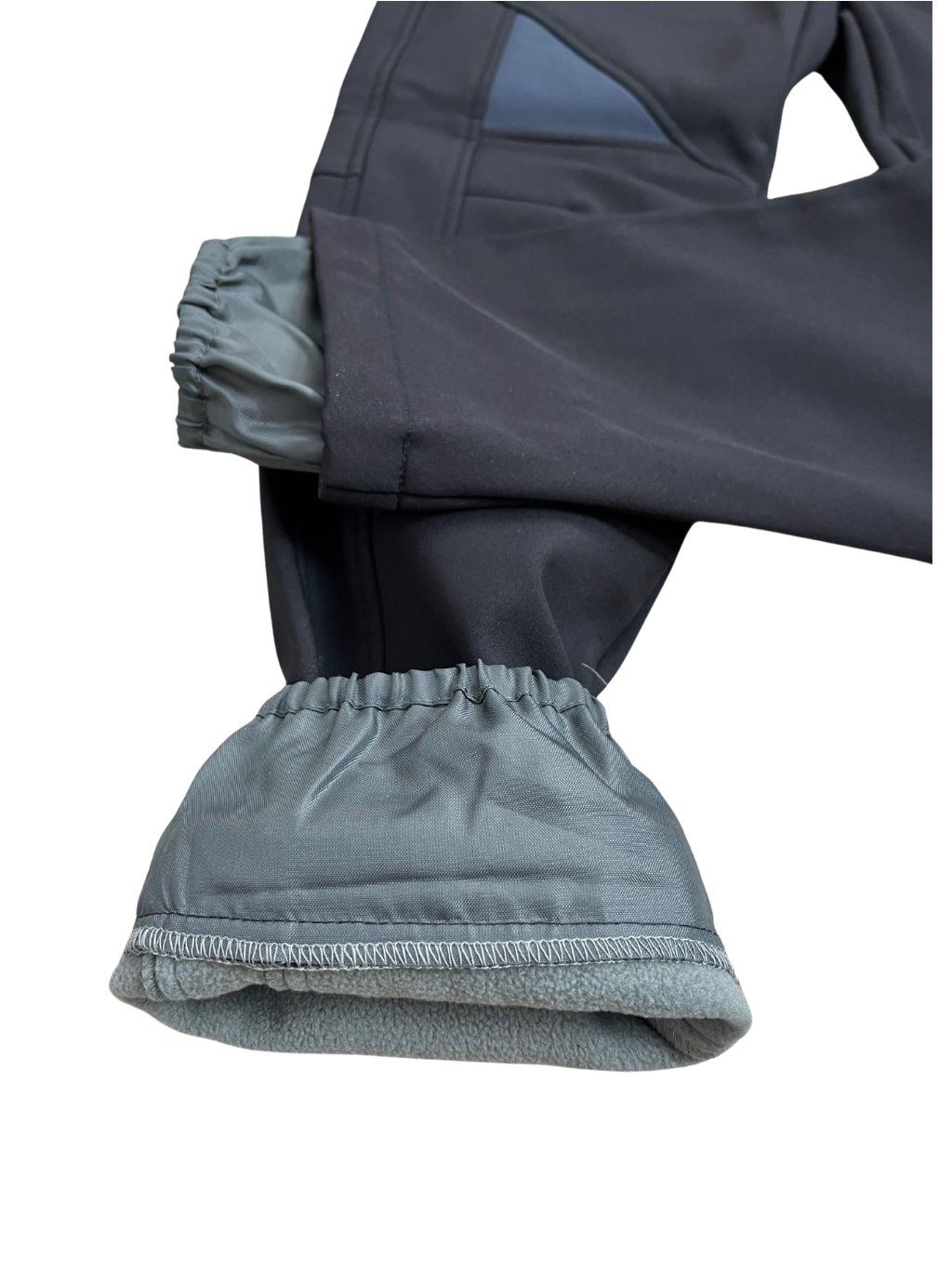 Kalhoty zateplené flaušem jsou vodoodpudivé (tzn voda po nich stéká, nevsakuje se), odolné proti větru, v pase do širšího nápletu, v polovině šířky nápletu je guma a tkanička na stažení, dole v nohavici šusťáková vsadka , která brání vniknutí vody a nečistot do bot, na přední straně dvě kapsy na zip reflexní prvky.