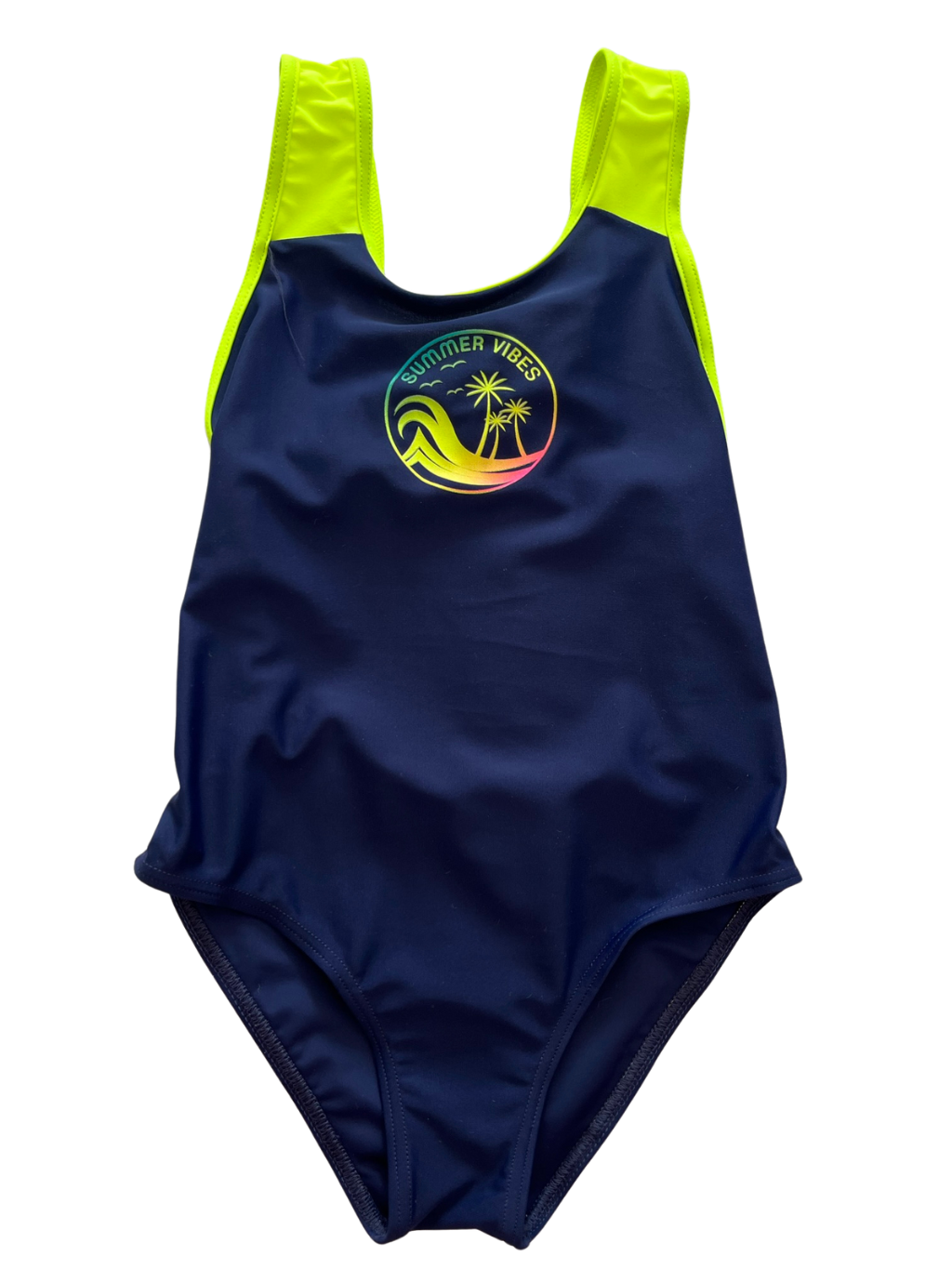 Dívčí jednodílné plavky, v rozkroku druhá vrstva, záda vykrojená.