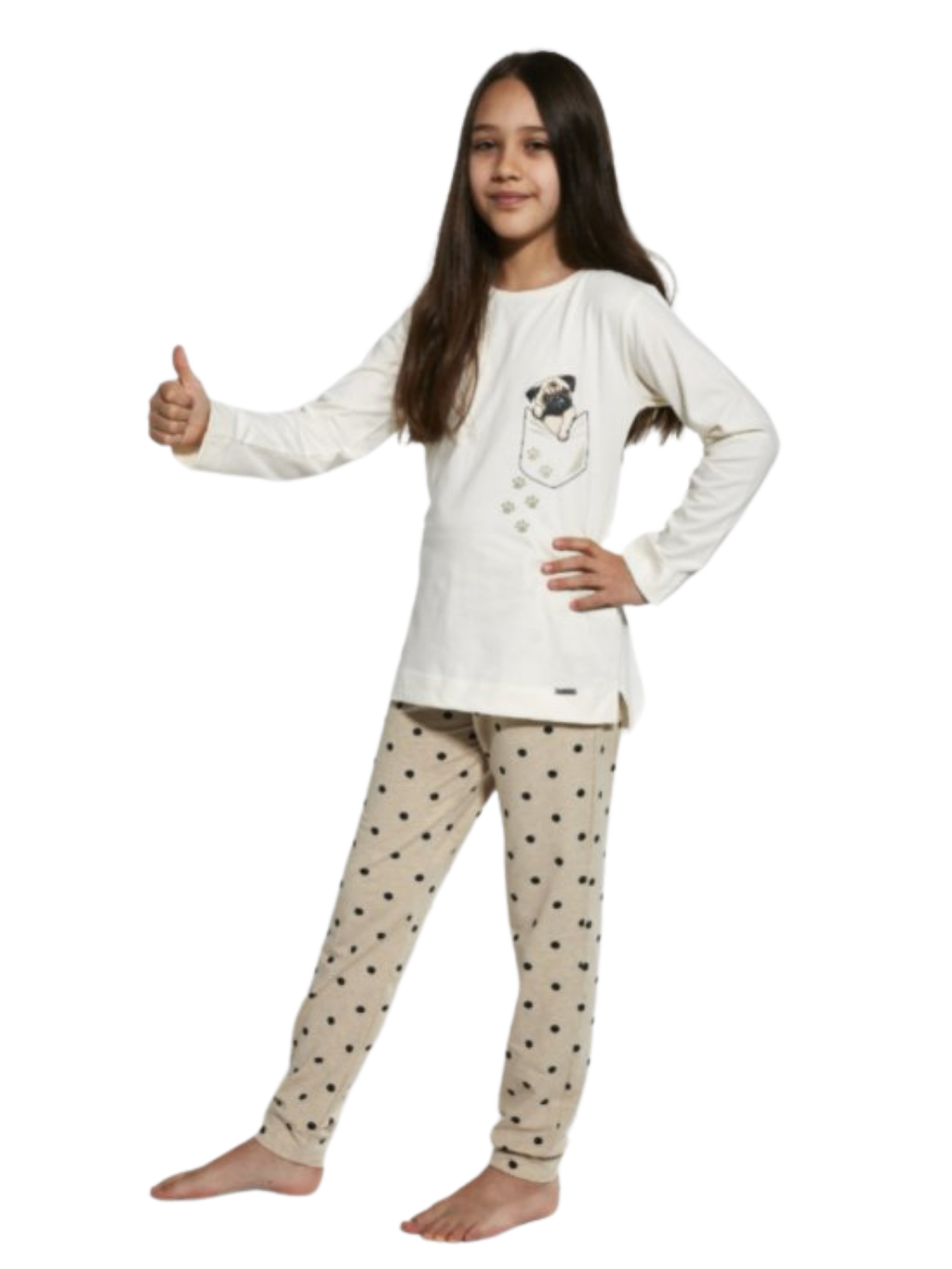 Nápadité komfortní pyžamko s dlouhým rukávem oblíbené značky Cornette vyrobené z vysoce kvalitní vyjímečně pěkné a měkké bavlny. Vrch je na přední straně zdobený roztomilým potiskem a kalhoty jsou s jemným vzorem. Pyžamko s roztomilým mopsíkem v kapse na triku a puntíčky na kalhotech si Vaše děti okamžitě zamilují. Celé pyžamko je rovné bez lemů, jen konce nohavic jsou do širší příjemné gumy.