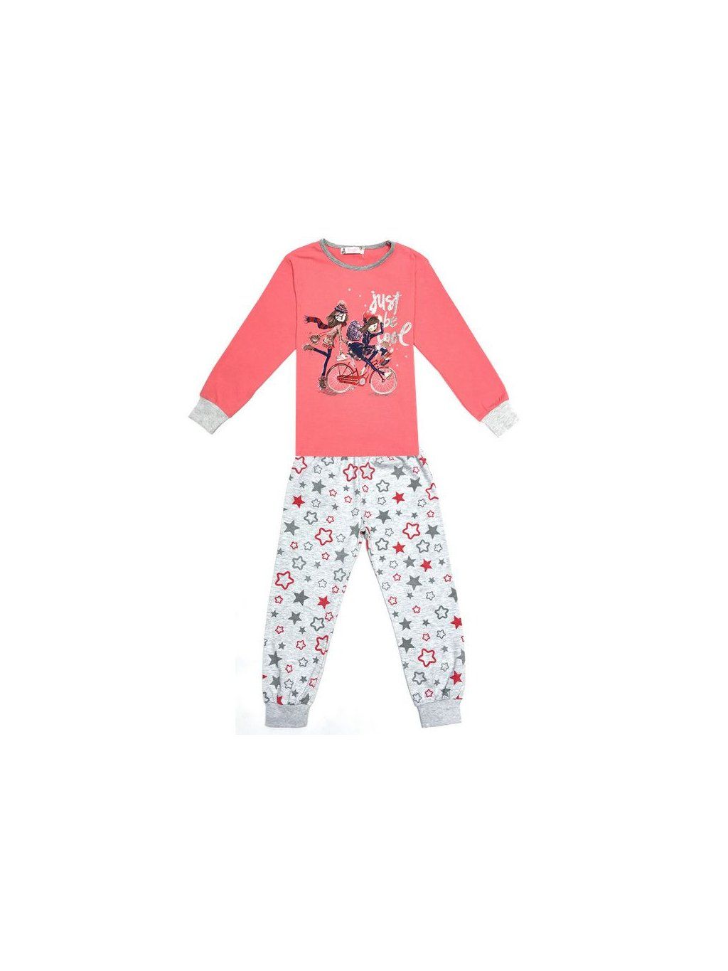 Dívčí pyžamo s dlouhým rukávem a dlouhýmí nohavicemi dole do rantlu, v pase pružná gumička. Velikosti odpovídají.