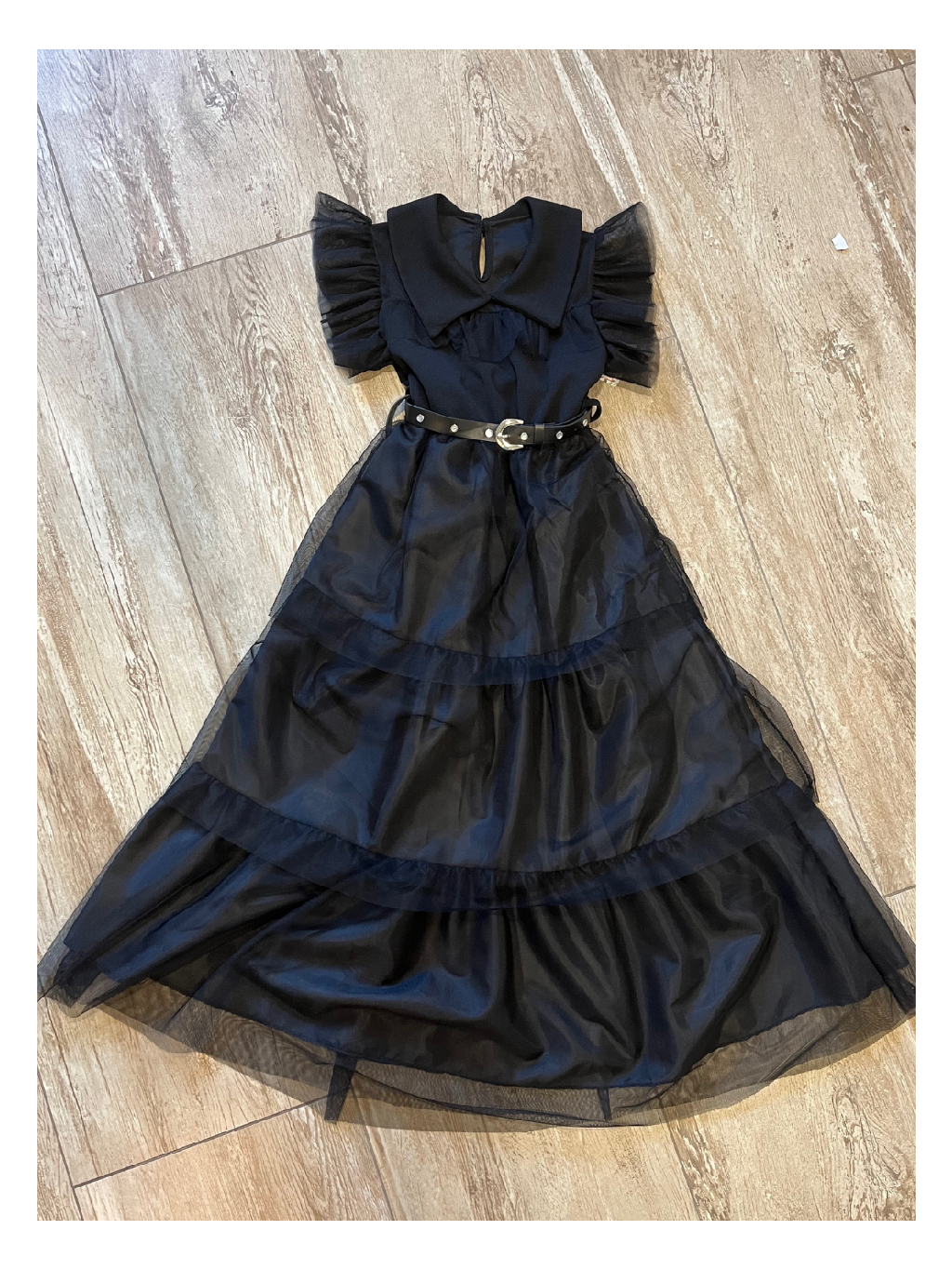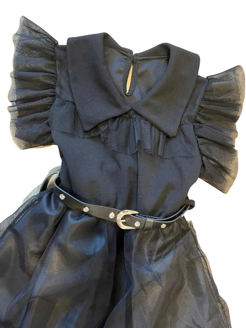 Dívčí tylové šaty, napodobující šaty filmové postavy Wednesday. Materiál: 95% Polyester, 5% Elastan. V pase pružná gumička. Doplněno páskem. Šaty mají spodničku a na tom našité postupné tylové kanýry. Vršek u ramenou je průsvitný, přes prsa už je spodnička.