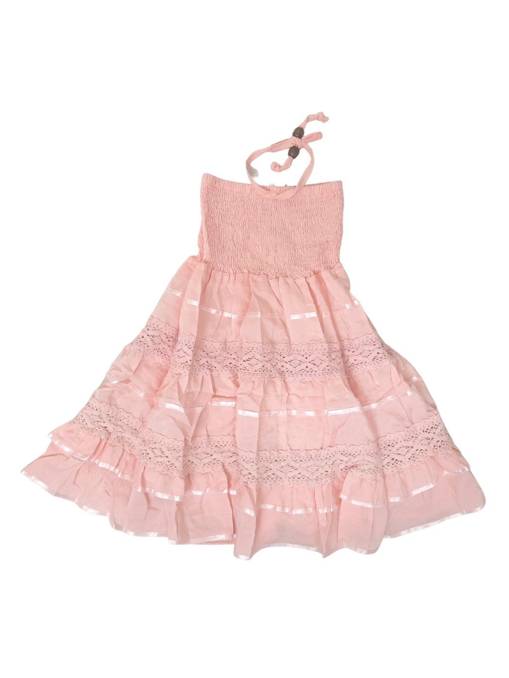Dlouhé dívčí letní šaty s volánky a krajkou. Přes prsa na žabičkování, na zavázání kolem krku. Vzdušný materiál.