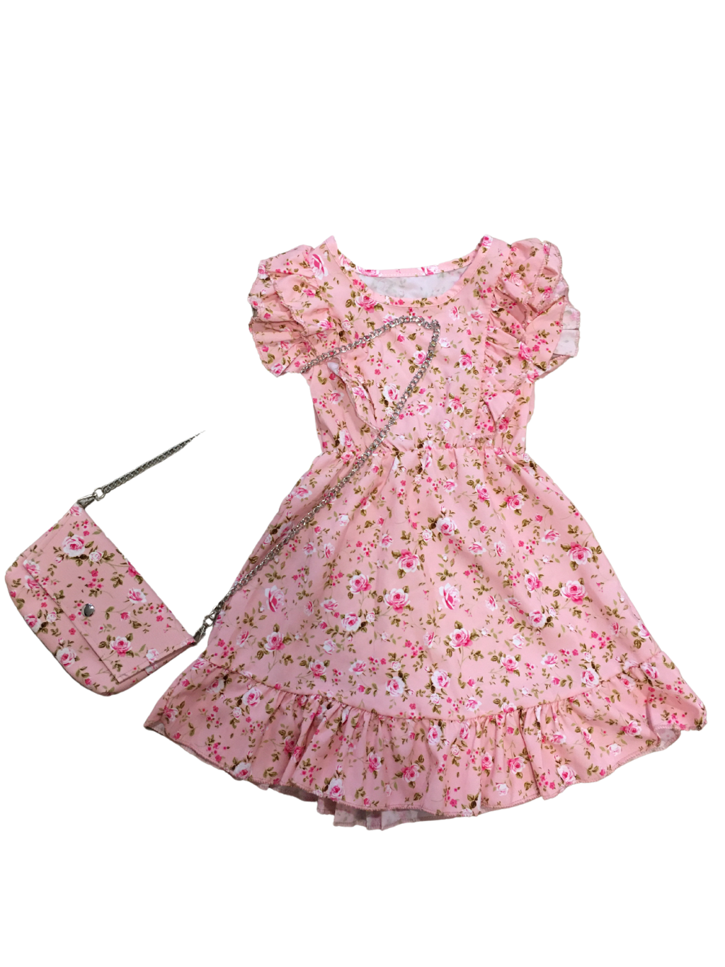 Dívčí letní šaty s volánky v květovaném vzoru. Doplněny kabelkou.
