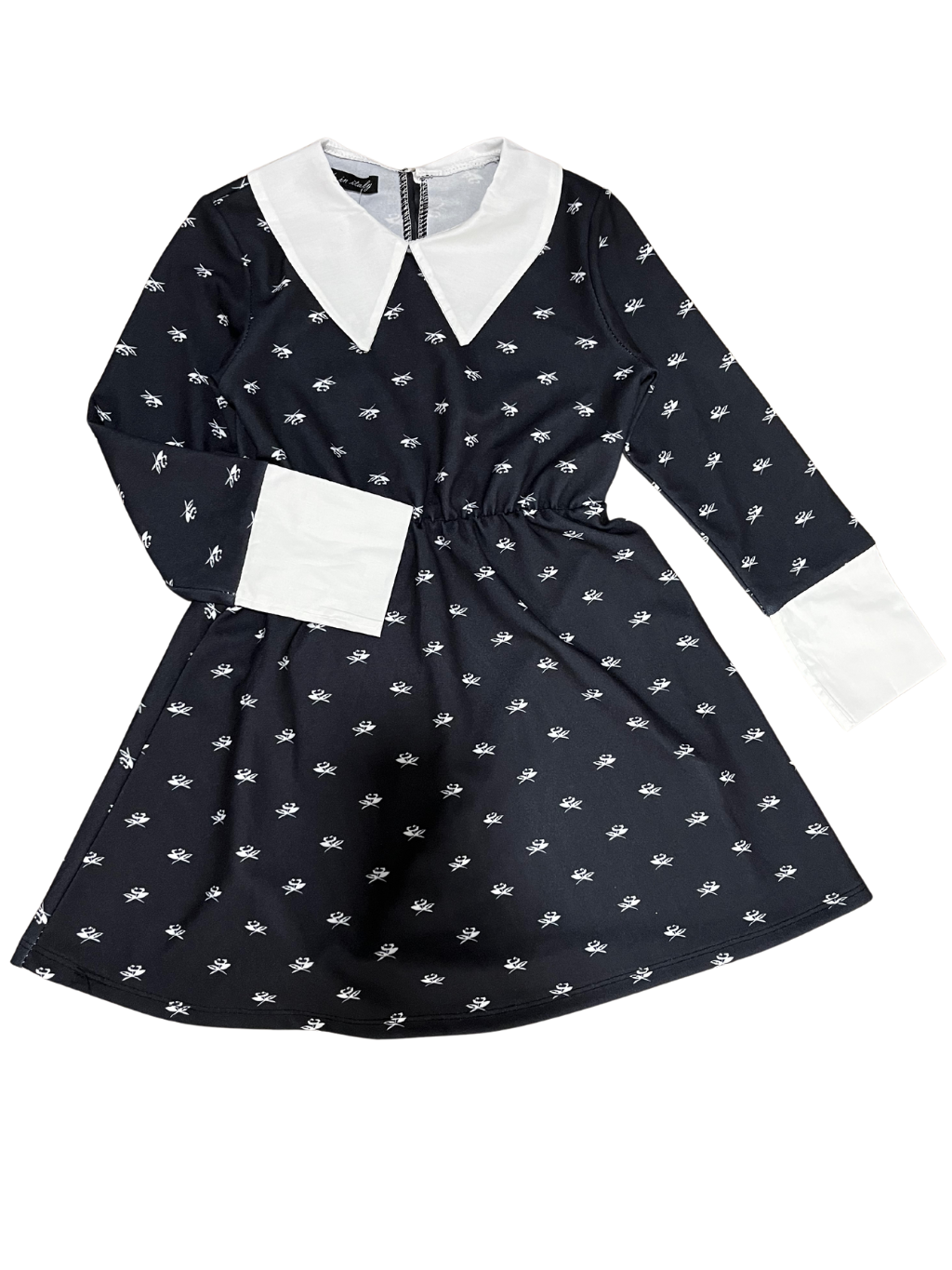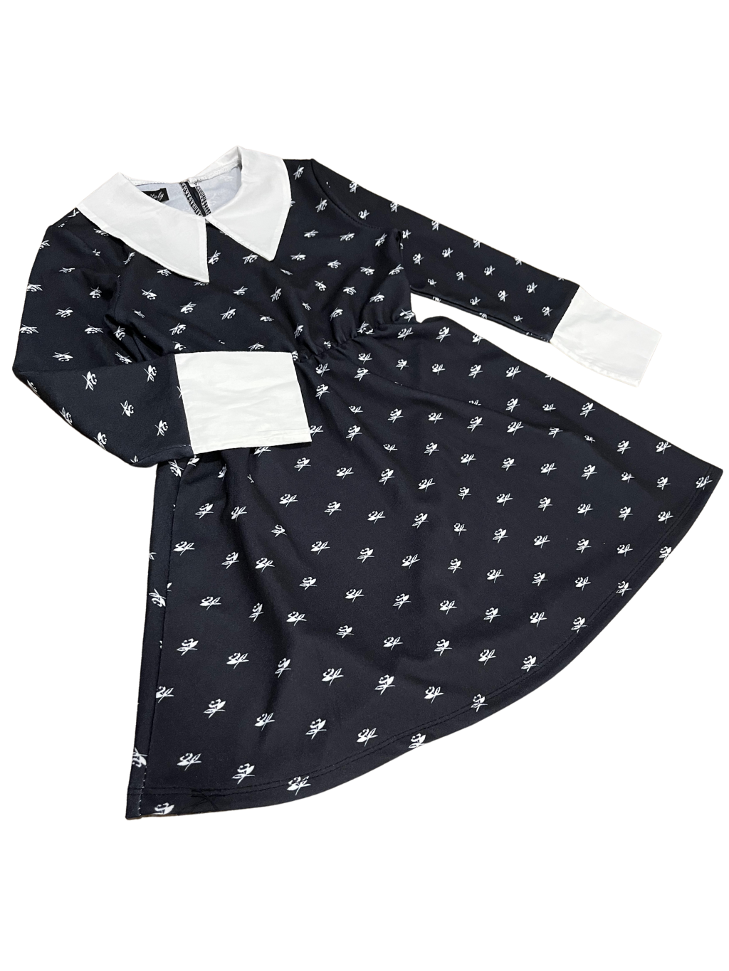 Dívčí šaty s košilovým límečkem, dlouhé rukávy zakončené košilovou manžetou. Šaty napodobující šaty filmové postavy Wednesday. Materiál: 92% Polyester, 8% Elastan. V pase pružná gumička.