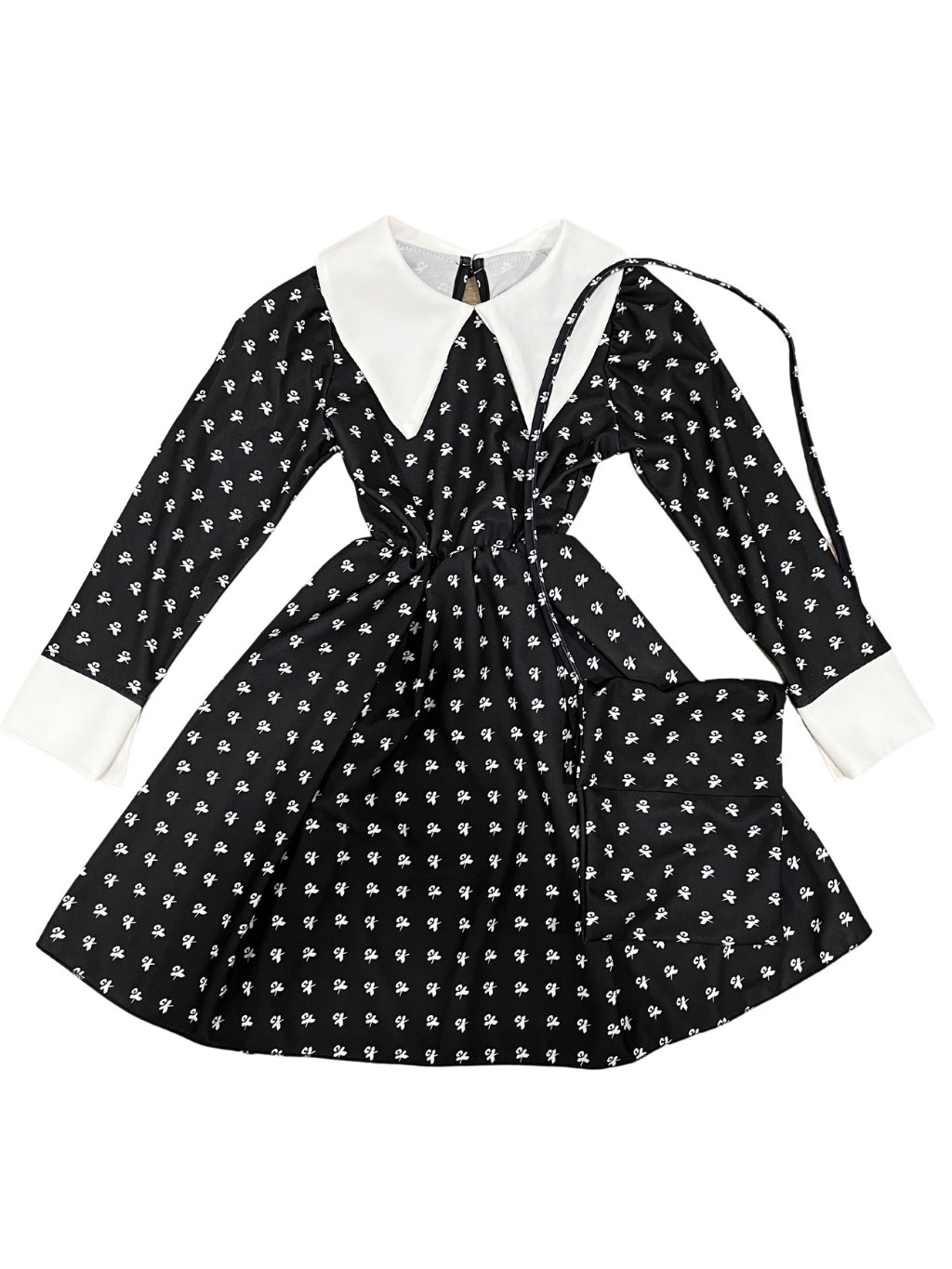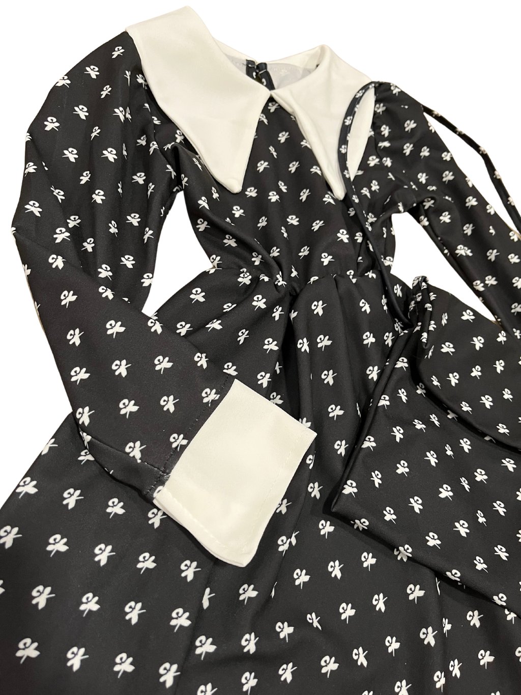 Dívčí šaty s dlouhým rukávem, s límečkem, napodobující šaty filmové postavy Wednesday. Šaty jsou z jednoho materiálů, límeček a manžety nejsou košilové. Materiál: 95% Polyester, 5% Elastan. V pase pružná gumička. K šatům je i lehoučká taška přes rameno.