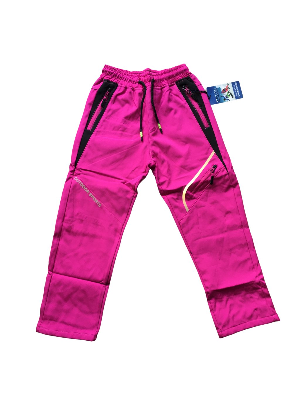 Kalhoty softshell teplý dětské dívčí a chlapecké dorost zateplené flaušem, v pase na gumu, šnurka na stažení, kapsy na zip, šusťáková vsadka na nohavici.