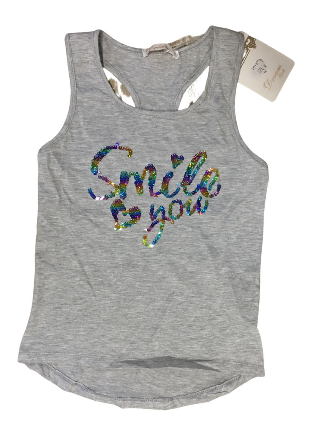 Dívčí bavlněné tílko s měnícími flitry, ramínka na zádech do kříže, záda jsou prodloužená. Příjemné k celodennímu nošení. Vhodné do školy, na doma i na výlet.