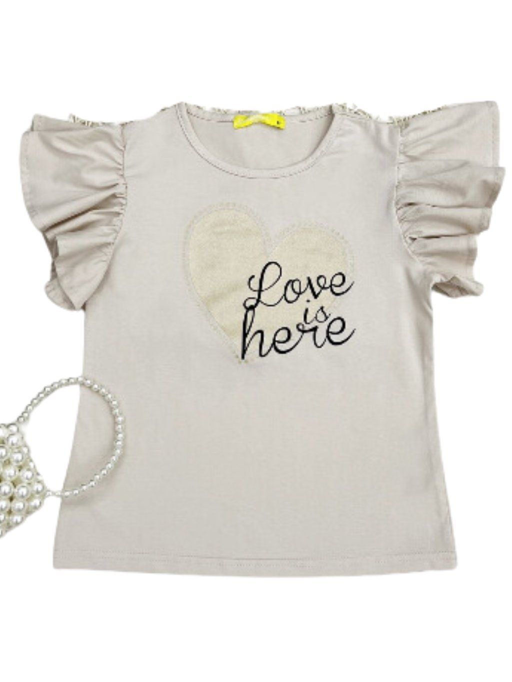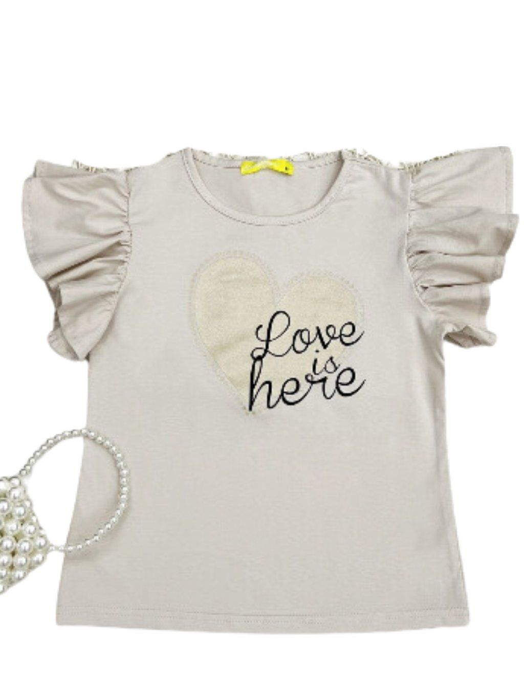 Krásné dívčí bavlněné tričko s krátkým rukávem, rukávy mají volánky. Tričko je vhodné k sukni i džegínám.