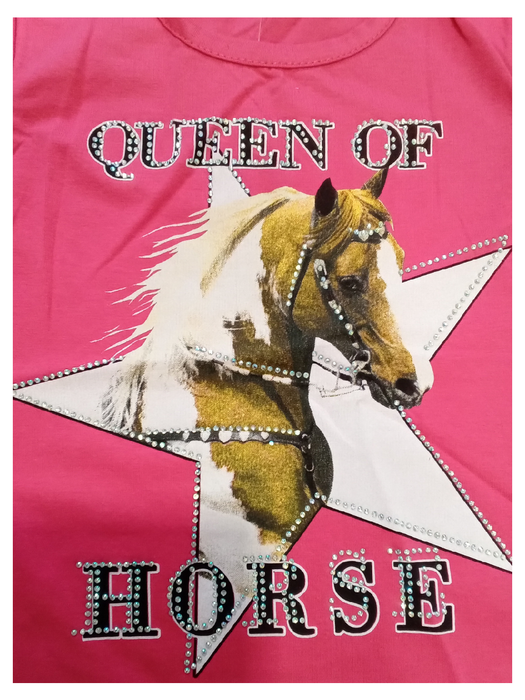 Dívčí tričko s krátkým rukávem, s obrázkem koně, doplněno kamínky.