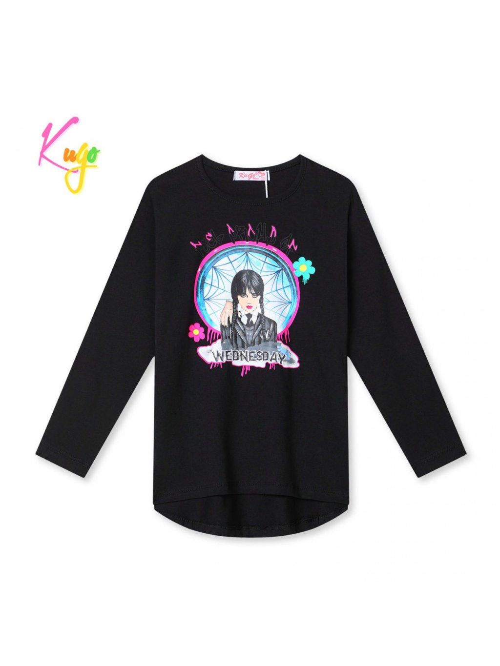 Dívčí tričko s dlouhým rukávem, bavlněné. S potiskem oblíbeného seriálové postavy Wednesday. Složení 95% bavlna, 5% elastan