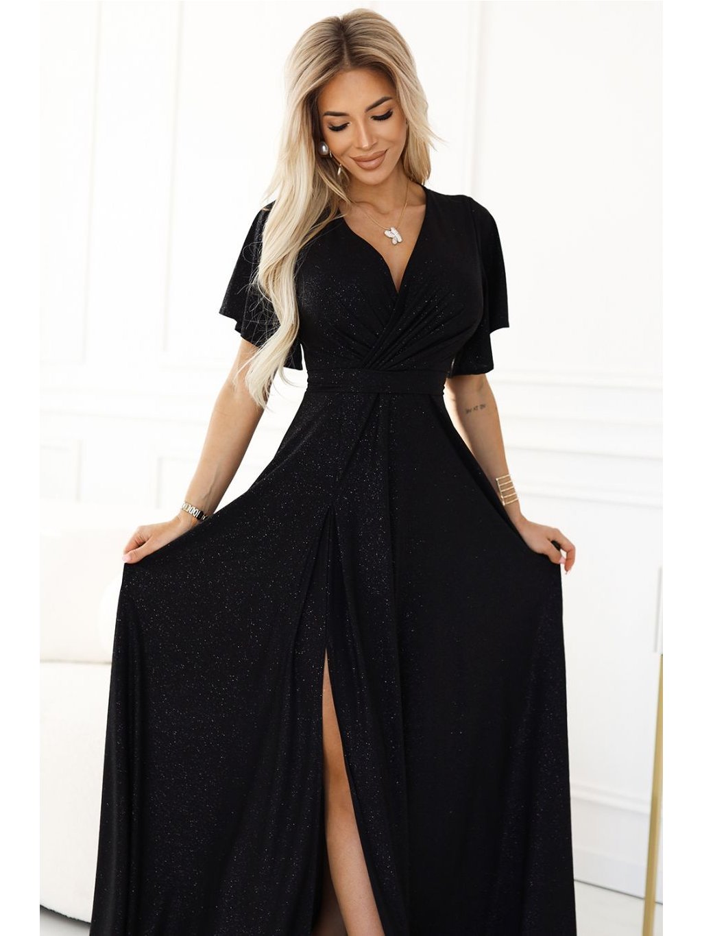 | <div class='desc-1'>Jennifer's dress is an elegant, long dress made of brocade black material. It has a spectacular envelope neckline, short sleeves and a slit on the leg, which adds lightness and feminine charm to the style. The fitted cut with a belt beautifully emphasizes the waist, and the shiny material gives the dress a unique shine. Perfect for evening outings, balls and elegant parties.<br>Polish product. Numoco brand. | |||||