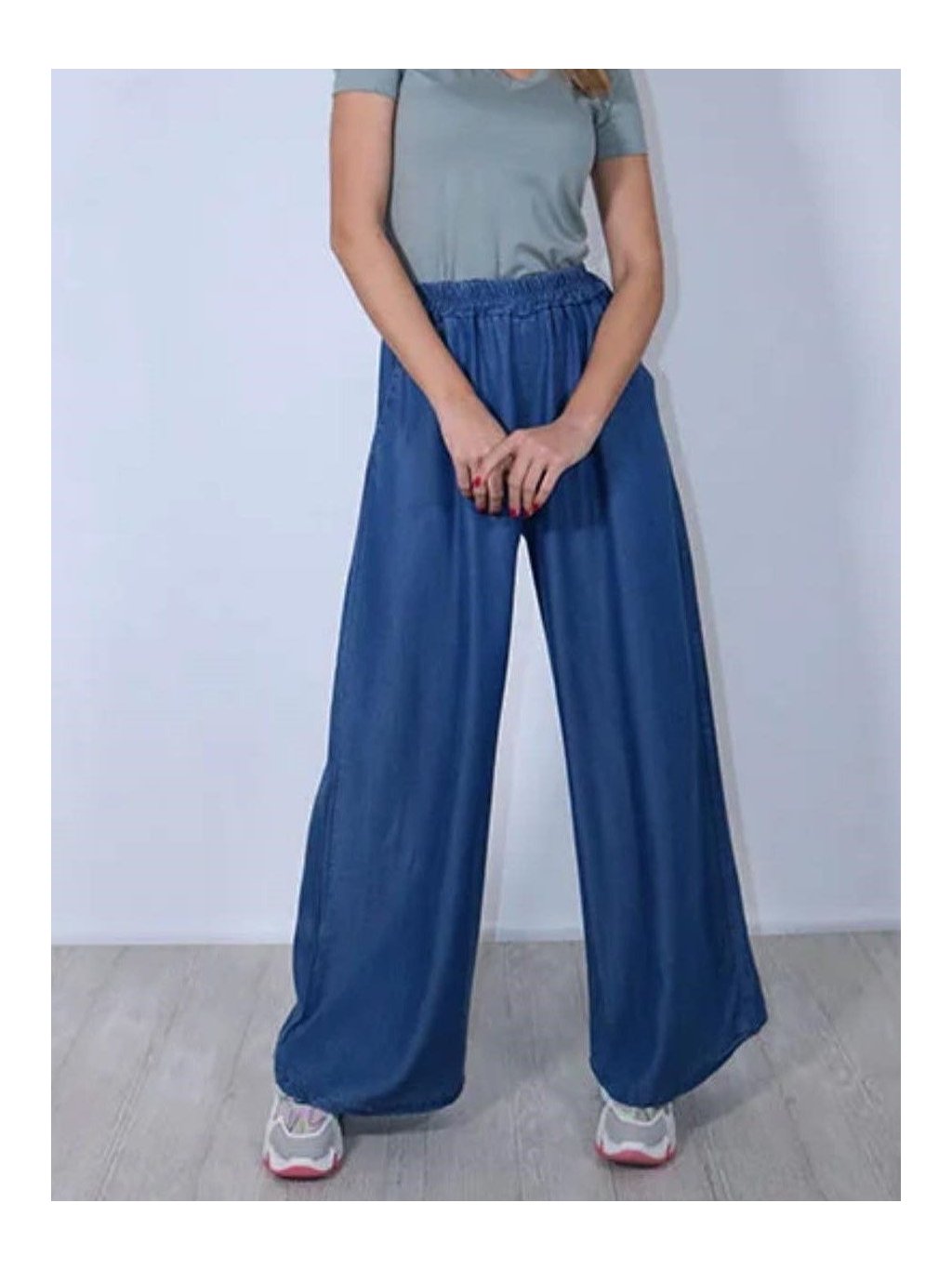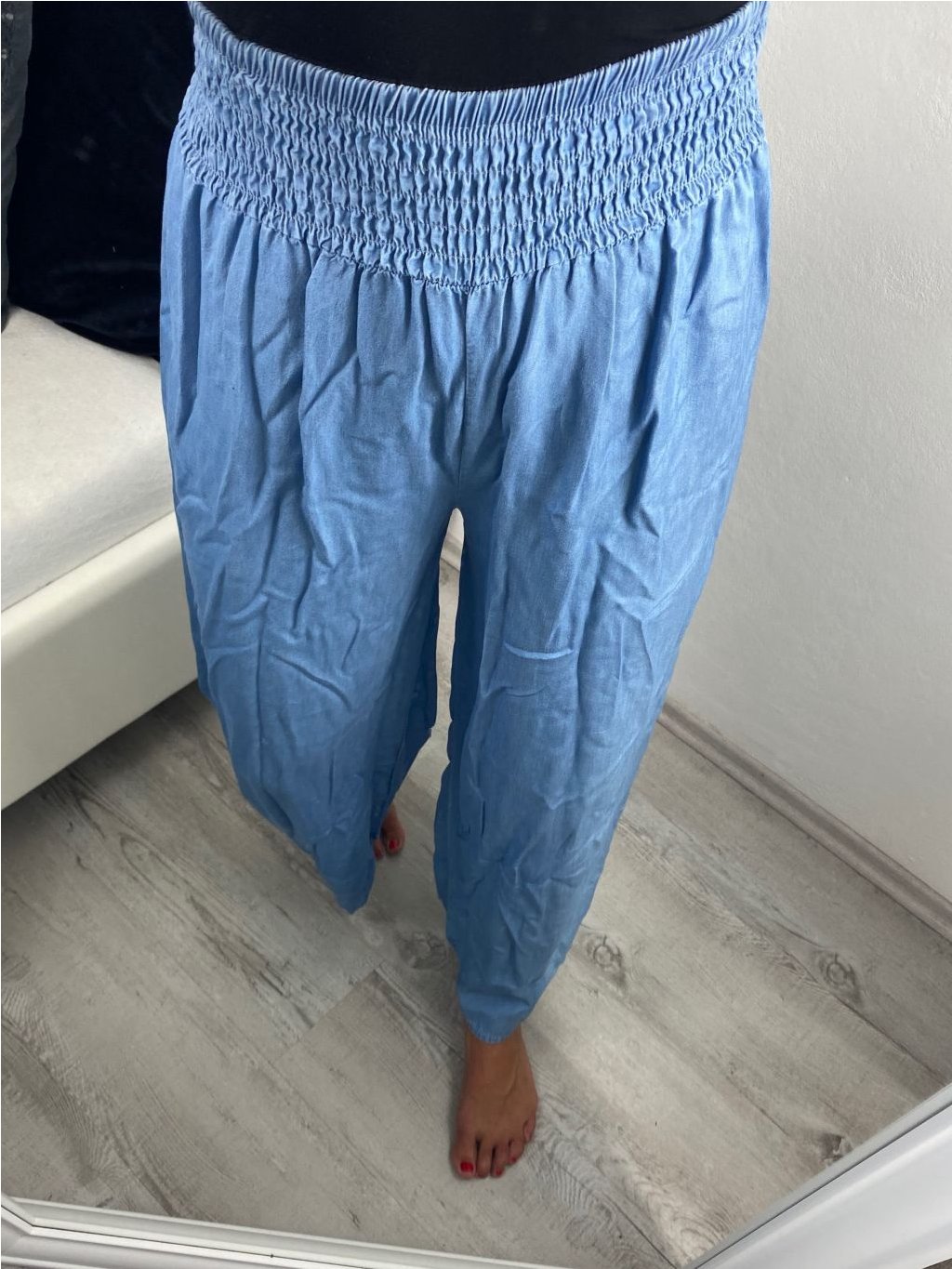 Dlouhé riflové kalhoty se širokými nohavicemi a žabičkováním v pase