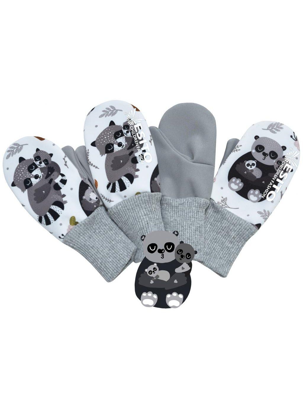 Na fotografii je vyfocena jedna rukavice z přední a druhá ze zadní strany. Spodní strana je šedá, vrchní strana dětské softshellové palcové rukavice je s potiskem Zvířátko.