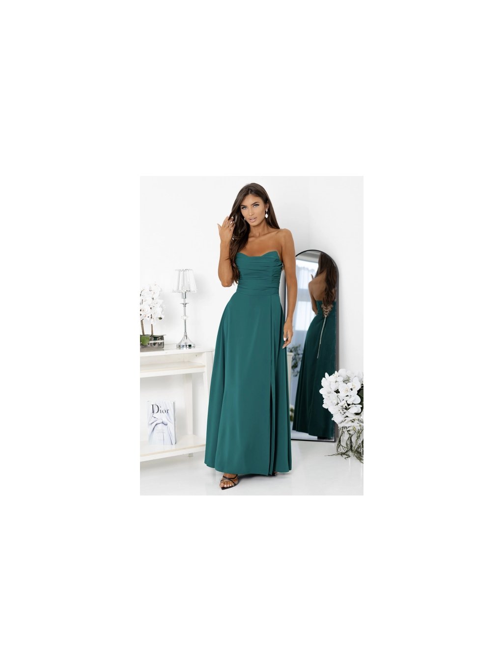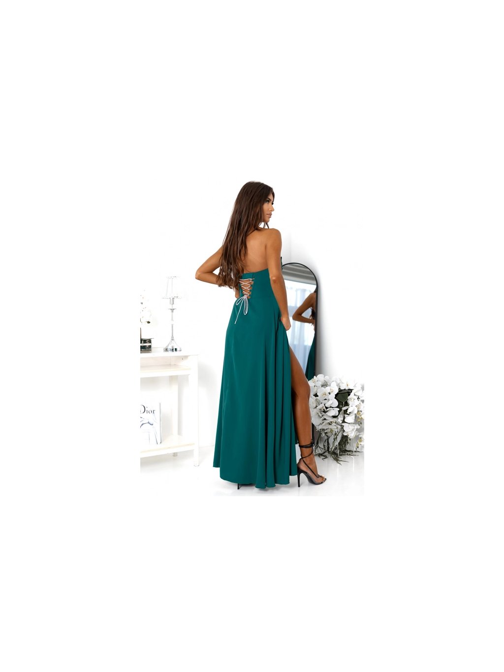 Dlouhé šaty z hladké, lesklé látky. Model s připínacími pásky, mírně nařazeným topem a působivým vysokým rozparkem na noze. Zadní část je zakončena nastavitelnou korzetovou vazou, která dokonale ladí s postavou. Rozšířený lem krásně zapadá do pohybu a vytváří lehký, elegantní efekt.