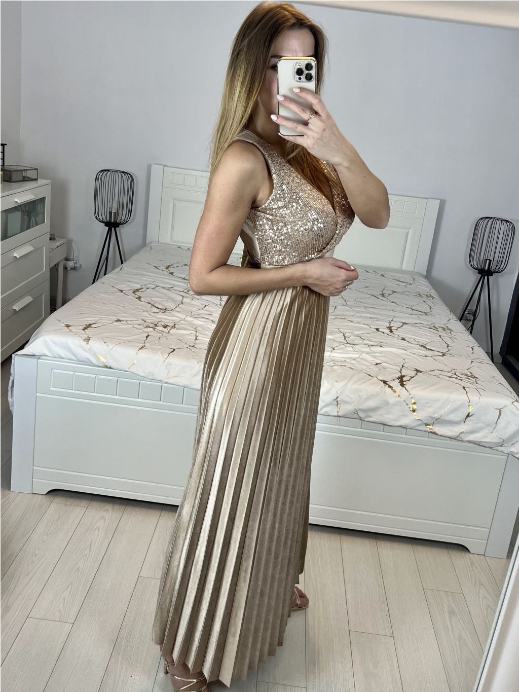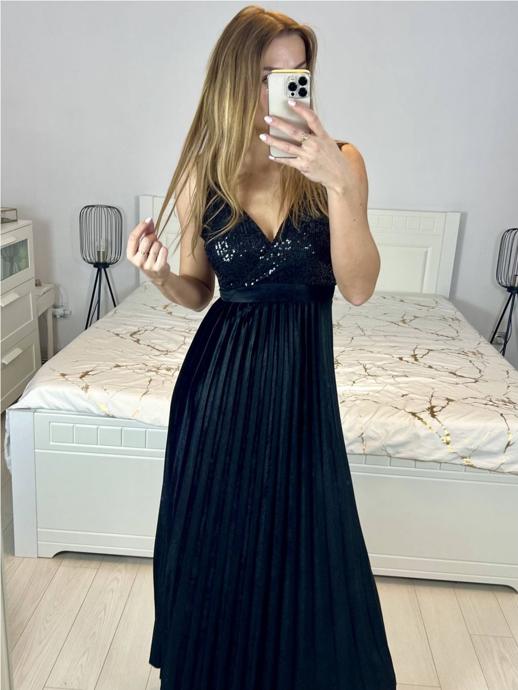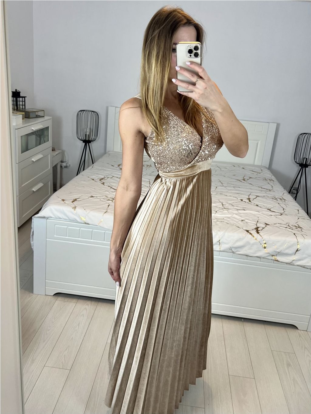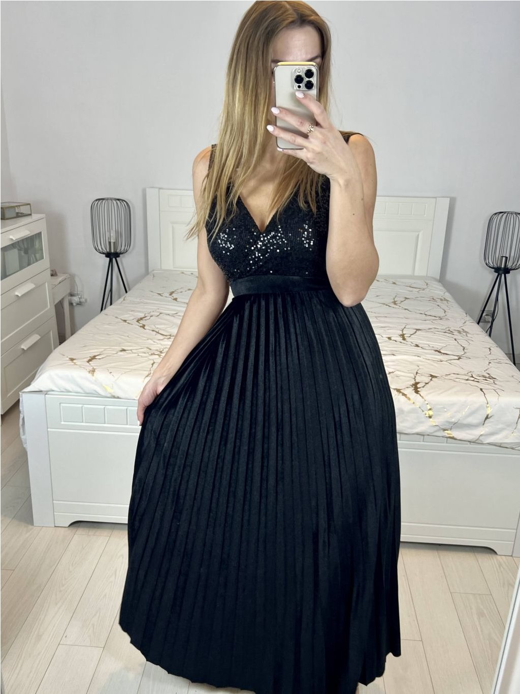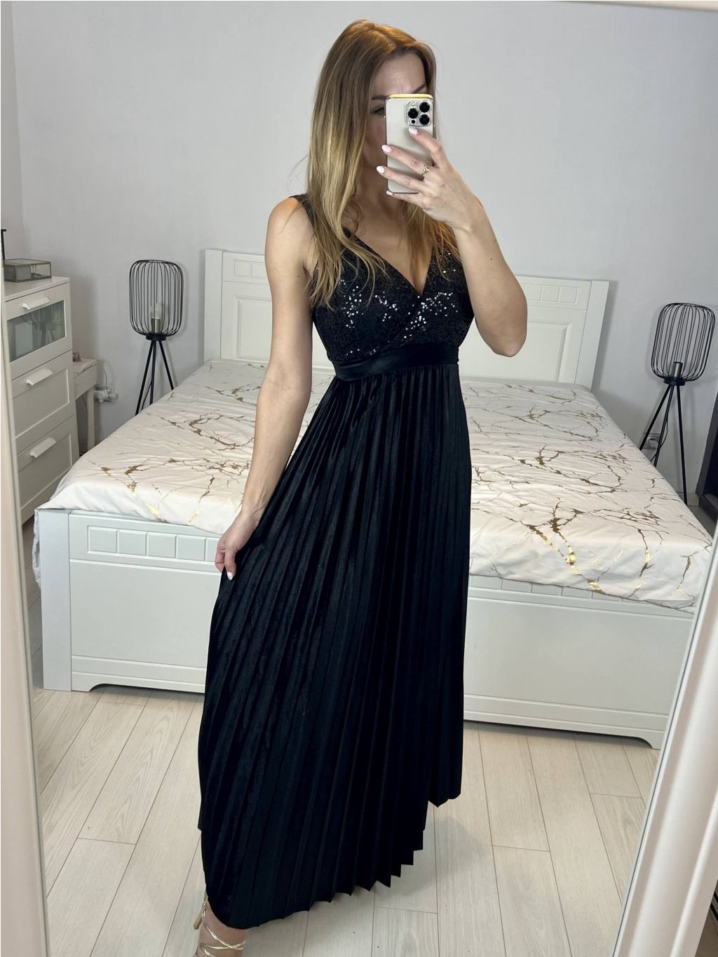 Dlouhé společenské šaty s flitrovým vrškem a sametovou skládanou sukní. Šaty mají prsní vycpávky.